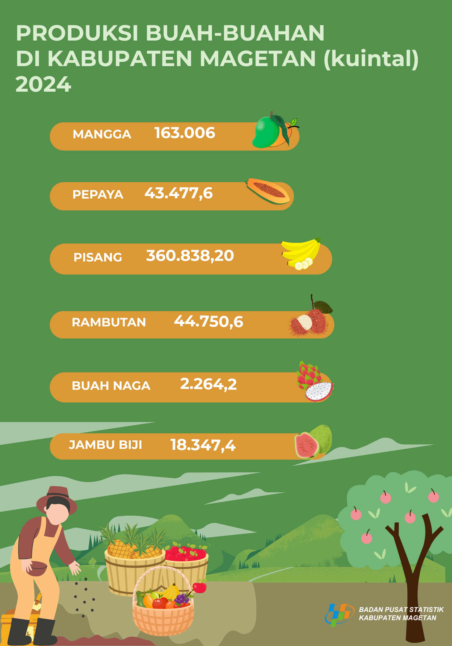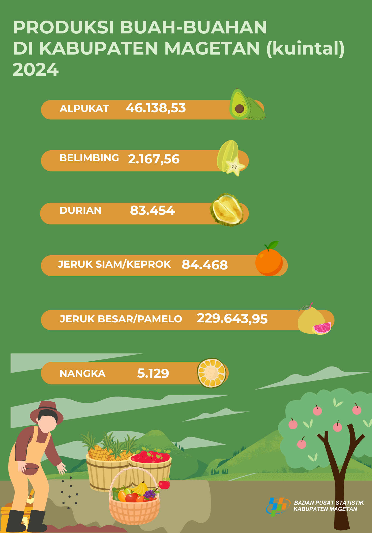 Total luas panen padi kabupaten Magetan tahun 2024 sebesar 43,41 ribu hektar dengan total produksi padi 272,25 ribu ton GKG.