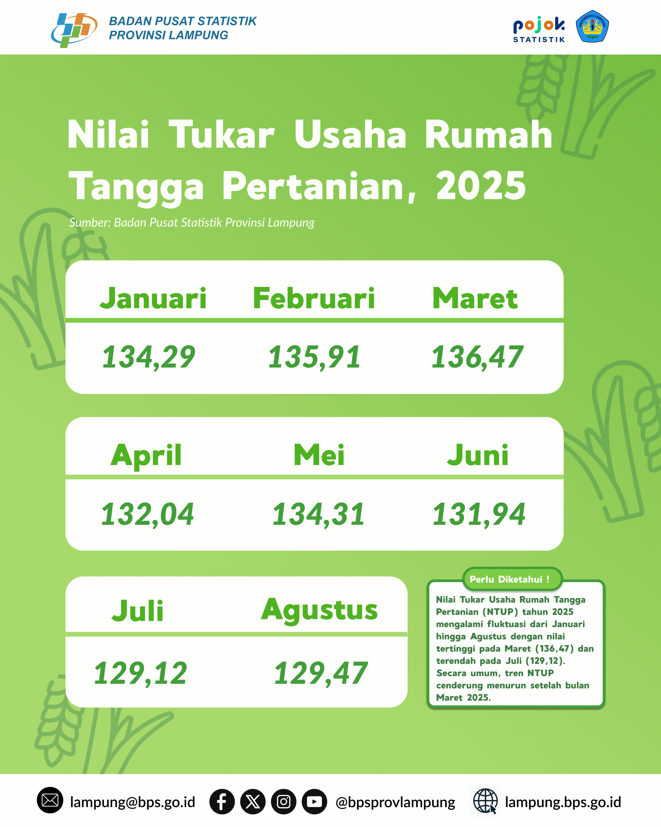 Berdasarkan data BPS Lampung, Nilai Tukar Usaha Rumah Tangga Pertanian (NTUP) tahun 2025 mengalami fluktuasi dari Januari hingga Agustus dengan nilai tertinggi pada Maret (136,47)...
