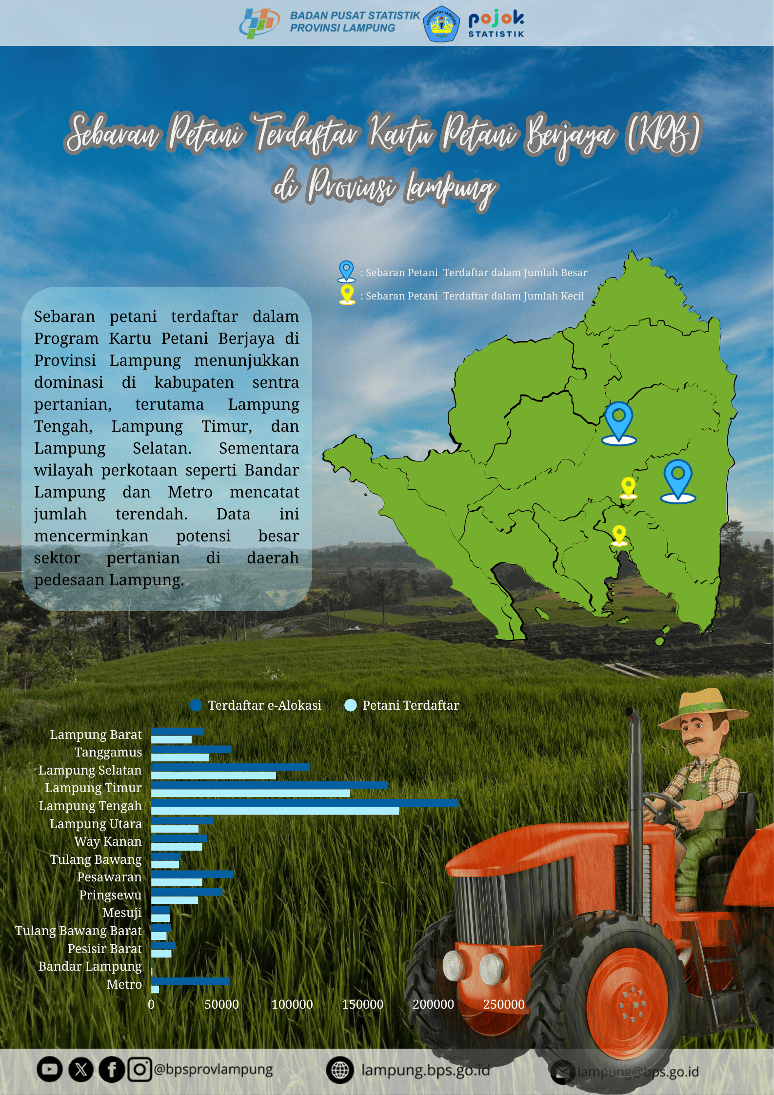 Sebaran petani terdaftar dalam Program Kartu Petani Berjaya di Provinsi Lampung menunjukkan dominasi di kabupaten sentra pertanian, terutama Lampung Tengah, Lampung Timur, dan Lampung Selatan....