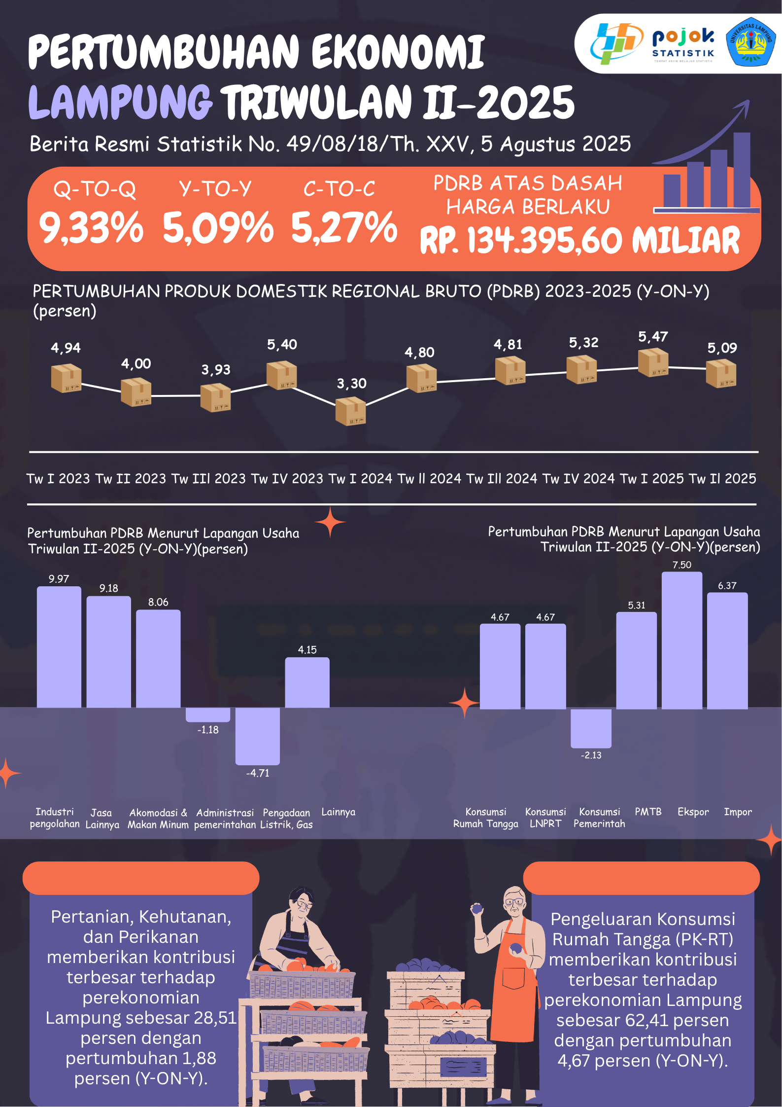Ekonomi Provinsi Lampung pada Triwulan II-2025 tumbuh sebesar 5,09 persen (y-on-y) dengan nilai PDRB atas dasar harga berlaku mencapai Rp134,39 triliun. Pertumbuhan ini didorong oleh...