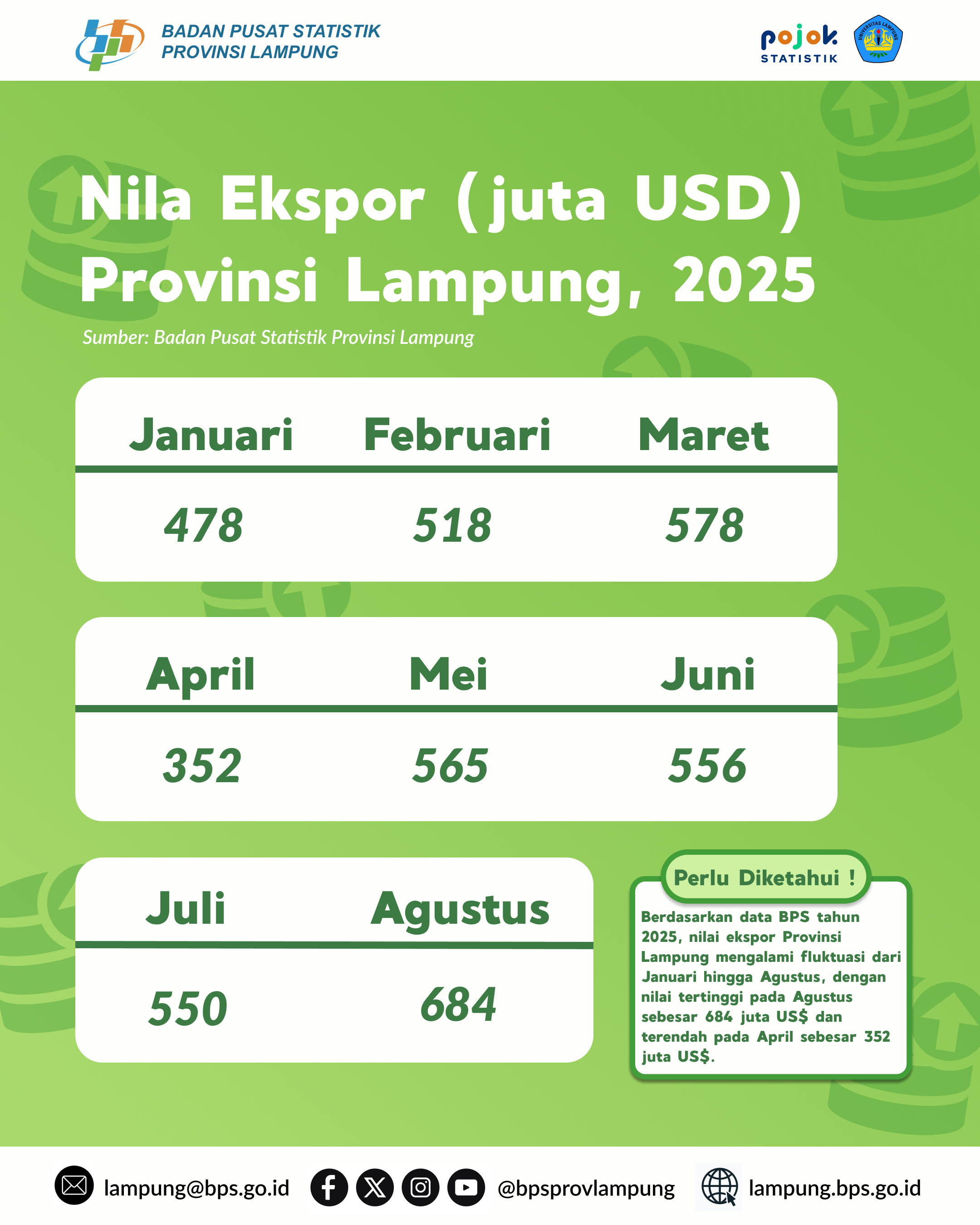 Berdasarkan data BPS tahun 2025, nilai ekspor Provinsi Lampung mengalami fluktuasi dari Januari hingga Agustus, dengan nilai tertinggi pada Agustus sebesar 684 juta US$ dan...