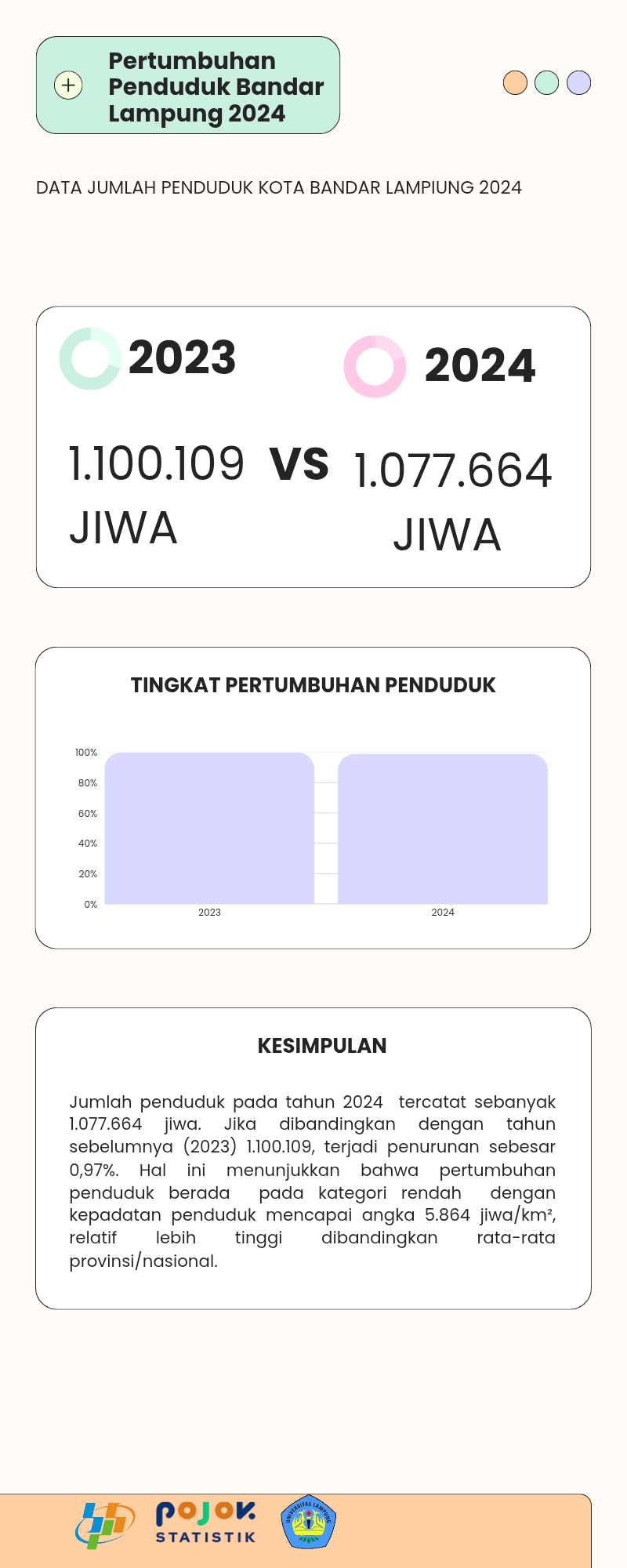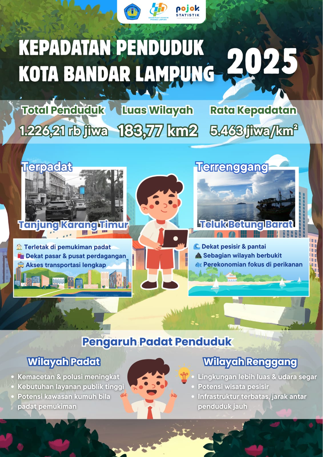 Berisi informasi mengenai total penduduk, luas wilayah, dan rata kepadatan kota Bandar Lampung. Beserta pengaruh padat penduduk