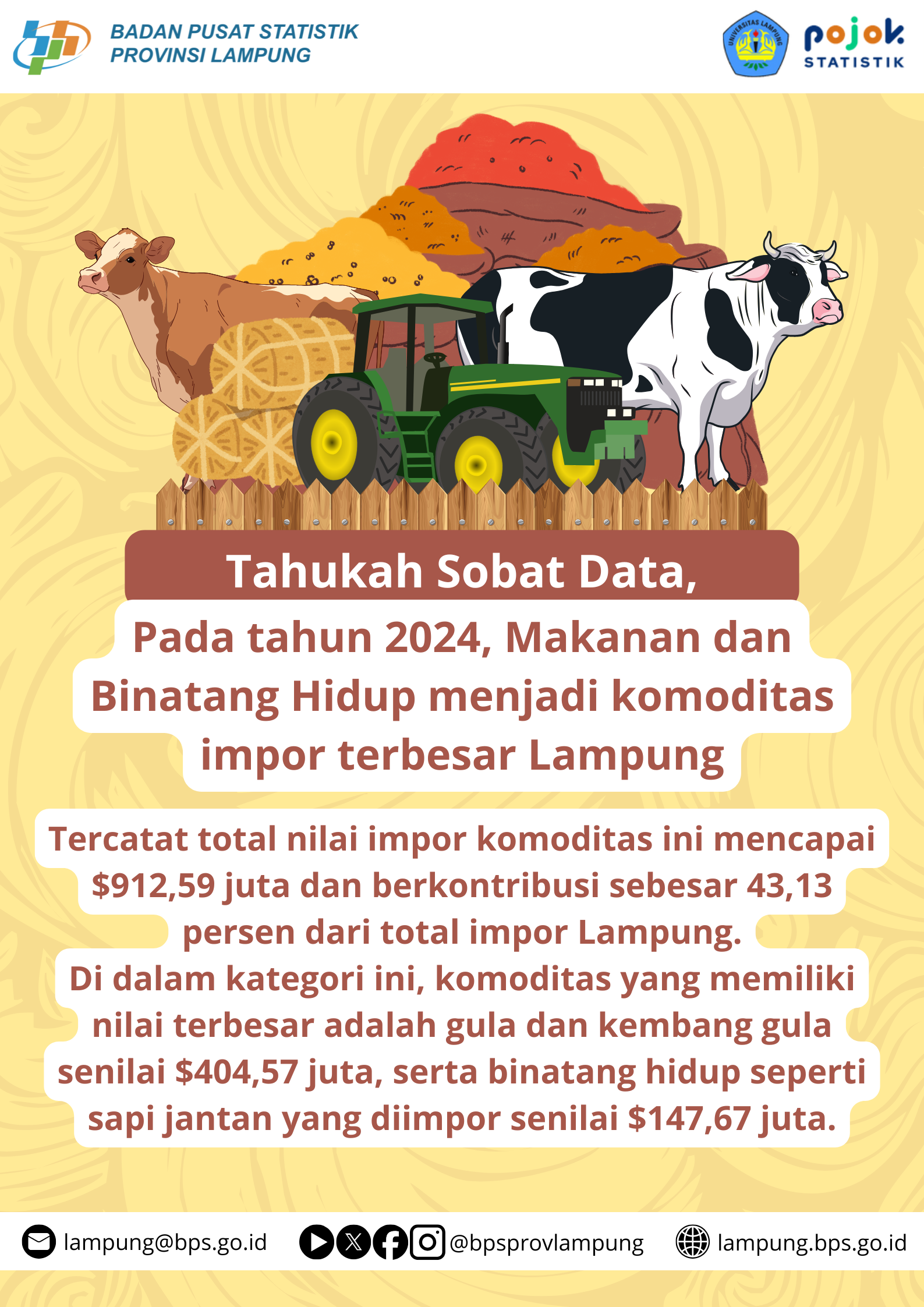 Pada tahun 2024, Makanan dan Binatang Hidup menjadi komoditas impor terbesar Lampung