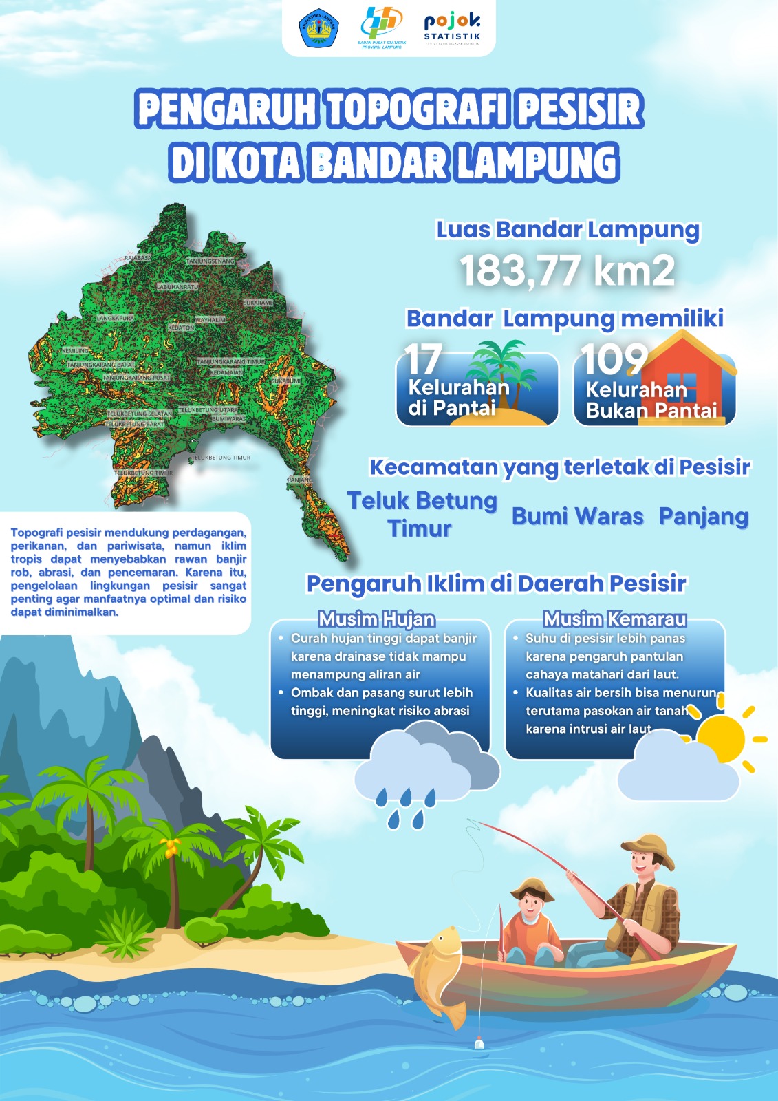 Berisikan luas Bandar Lampung, jumlah kelurahan di pantai, dan pengaruh iklim di daerah pesisir