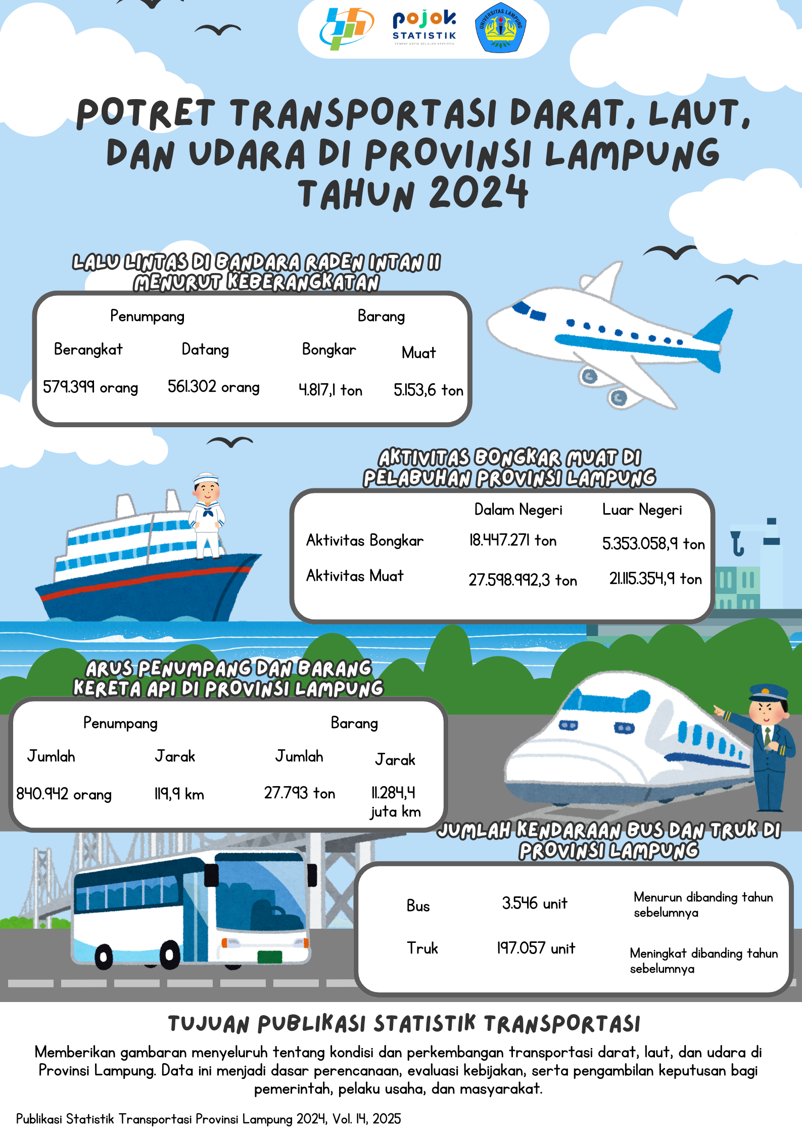 Infografis ini menggambarkan kondisi transportasi darat, laut, dan udara di Provinsi Lampung tahun 2024. Disajikan data lalu lintas penerbangan di Bandara Raden Intan II, aktivitas...