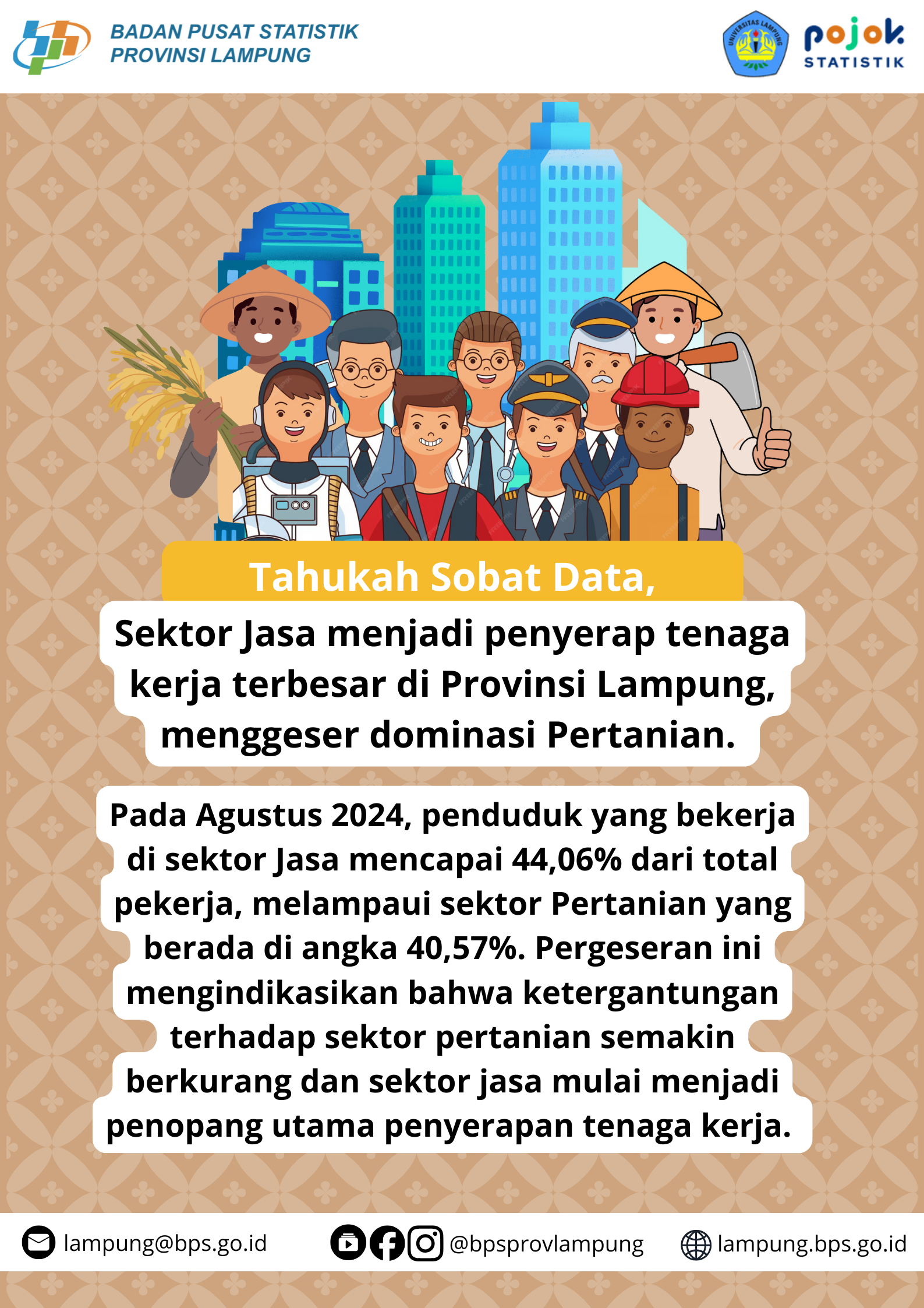 Sektor Jasa menjadi penyerap tenaga kerja terbesar di Provinsi Lampung, menggeser dominasi Pertanian.