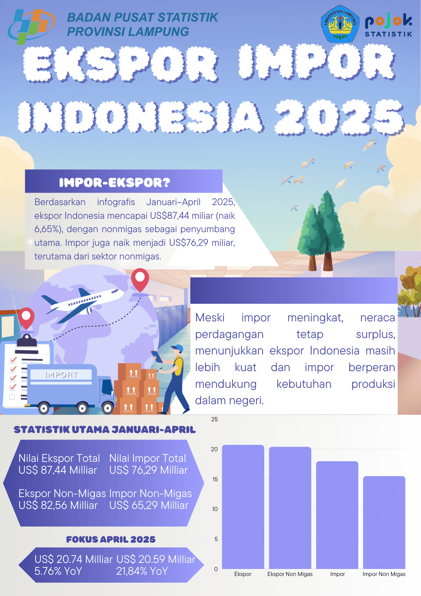 Ekspor Indonesia pada Januari–April 2025 mencapai US$87,44 miliar, lebih tinggi dari impor sebesar US$76,29 miliar, sehingga neraca perdagangan tetap surplus. Kenaikan ekspor terutama didorong oleh...
