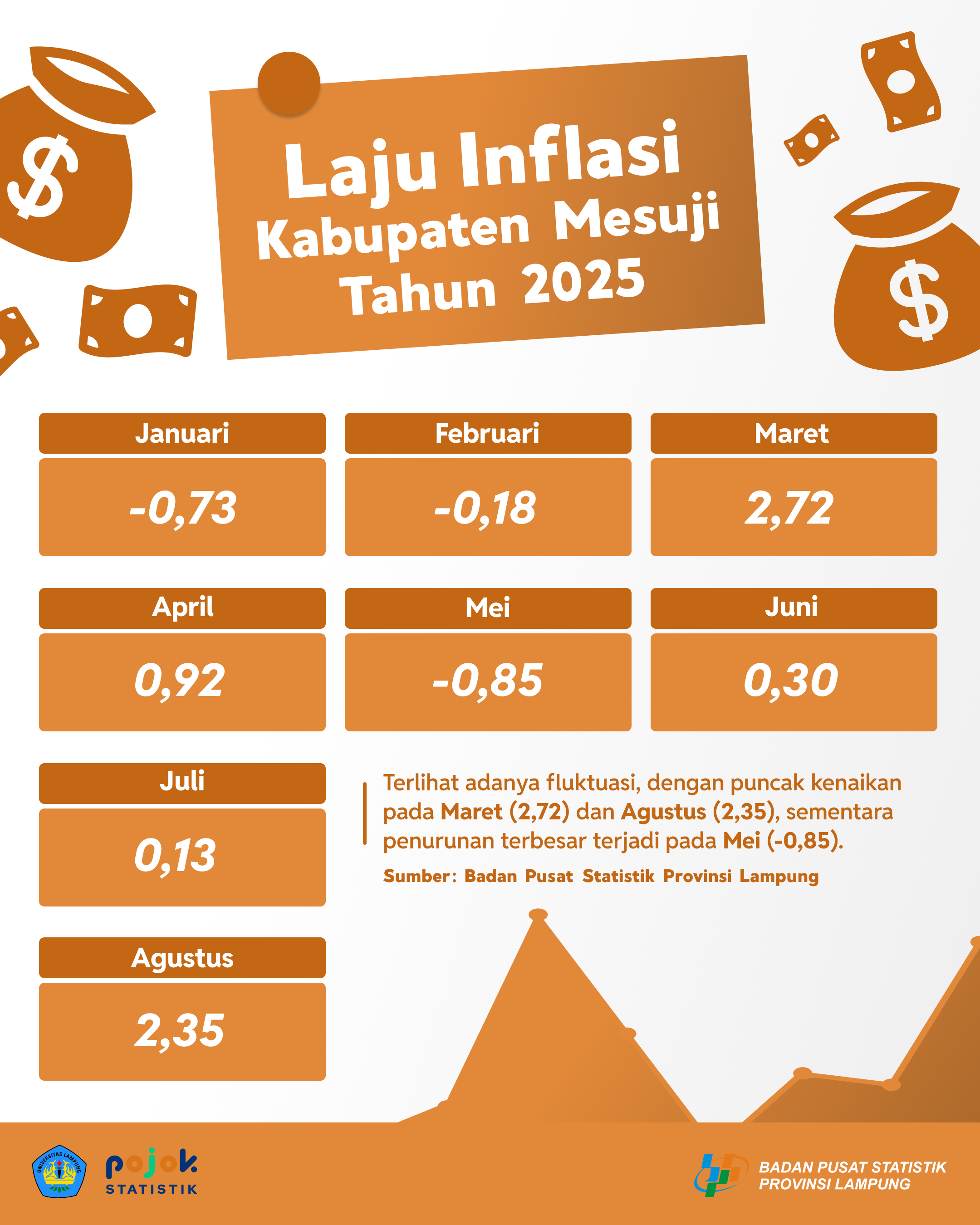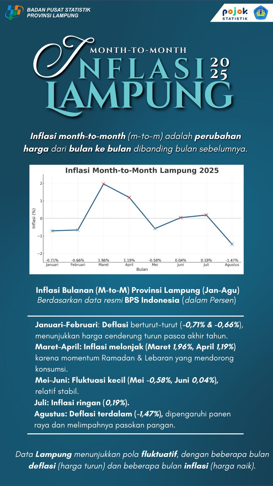 Data Januari-Agustus menunjukkan tren fluktuatif. Setelah negatif di awal tahun, capaian melonjak pada Maret (2,72) dan Agustus (2,35) sebagai puncak tertinggi, sementara titik terendah terjadi...