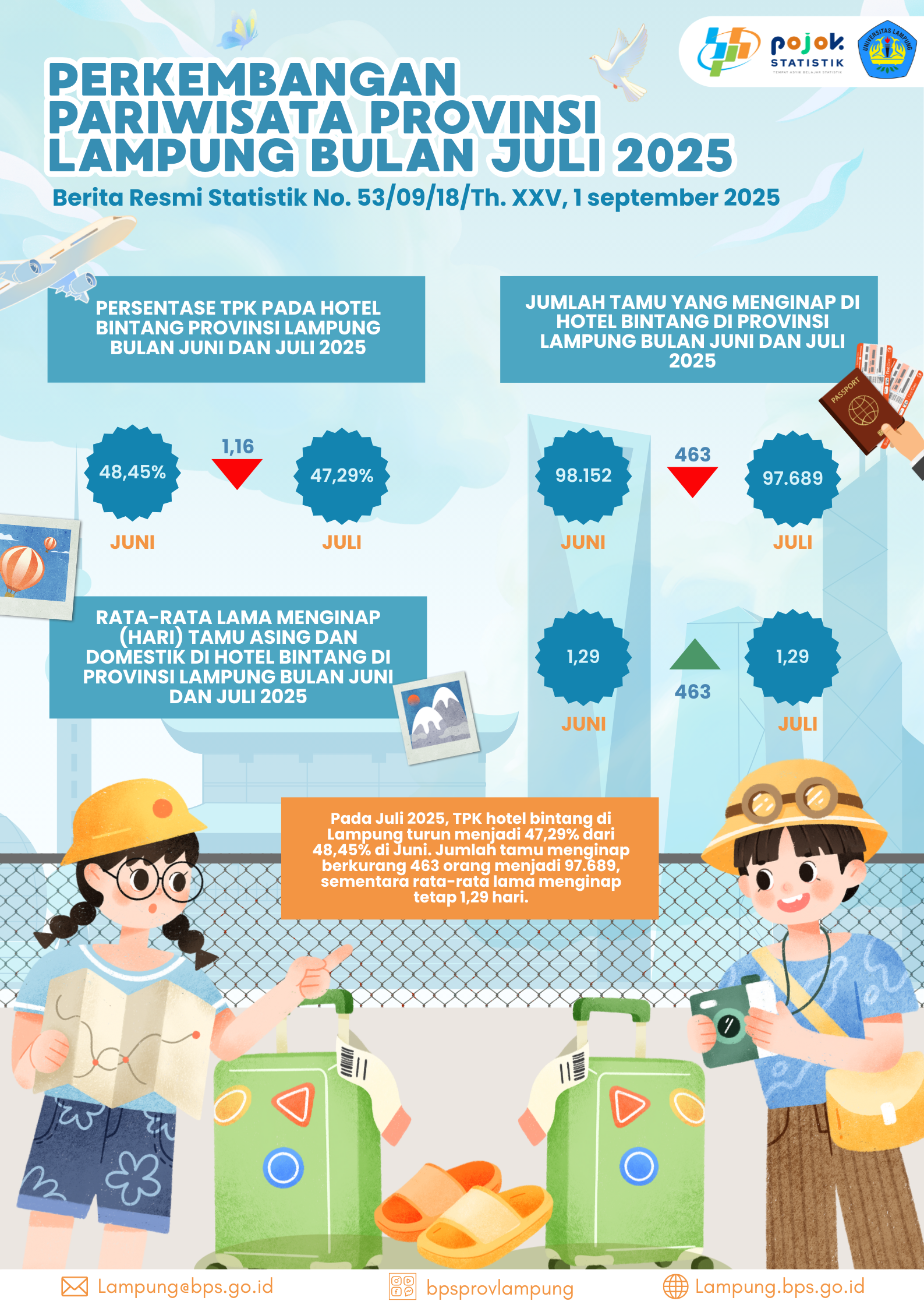 Berdasarkan Berita Resmi Statistik No. 53/09/18/Th. XXV tanggal 1 September 2025, perkembangan pariwisata di Provinsi Lampung pada Juli 2025 menunjukkan adanya penurunan kinerja pada beberapa...