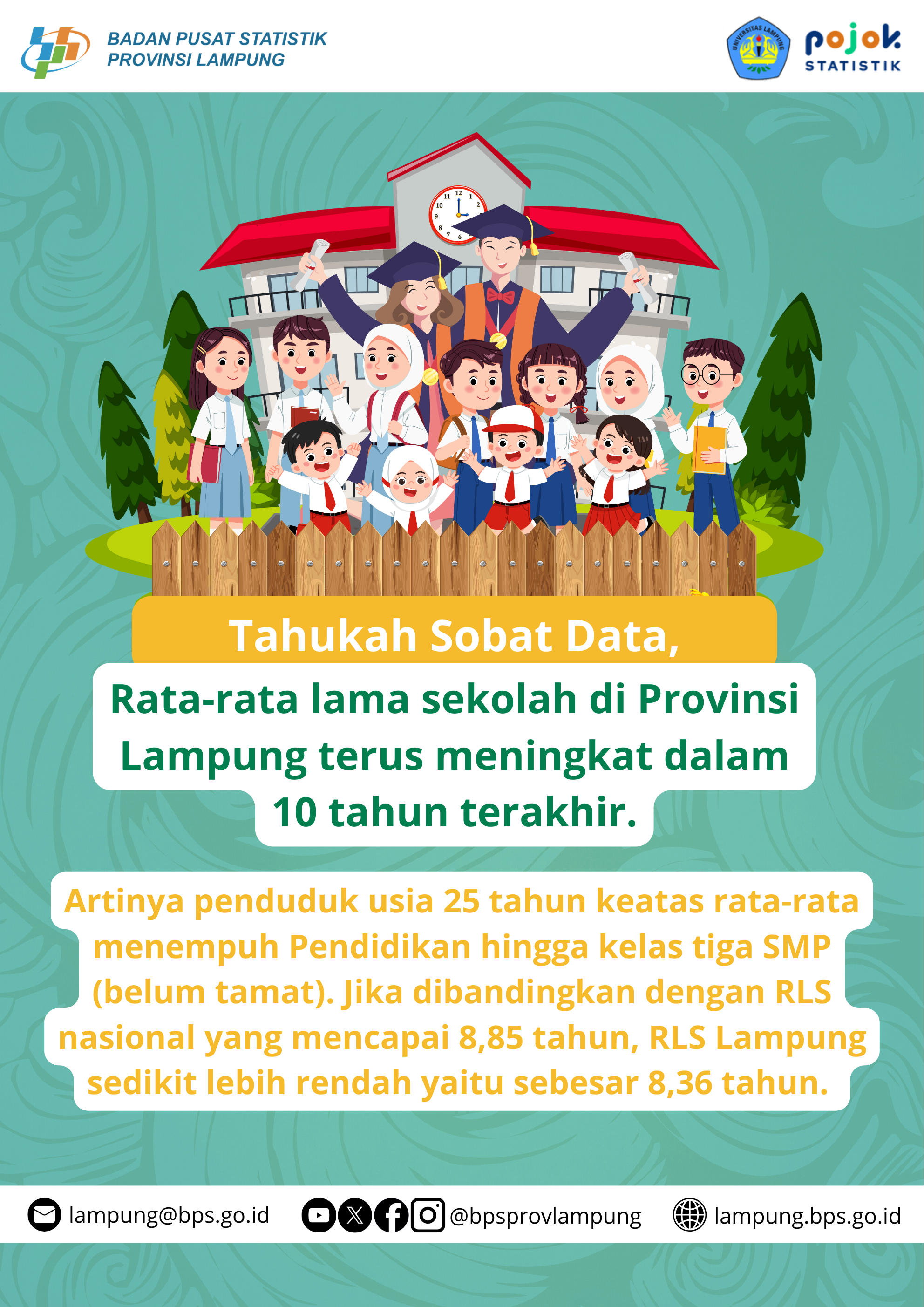 Penduduk usia 25 tahun keatas rata-rata menempuh Pendidikan hingga kelas tiga SMP (belum tamat). Jika dibandingkan dengan RLS nasional yang mencapai 8,85 tahun, RLS Lampung...