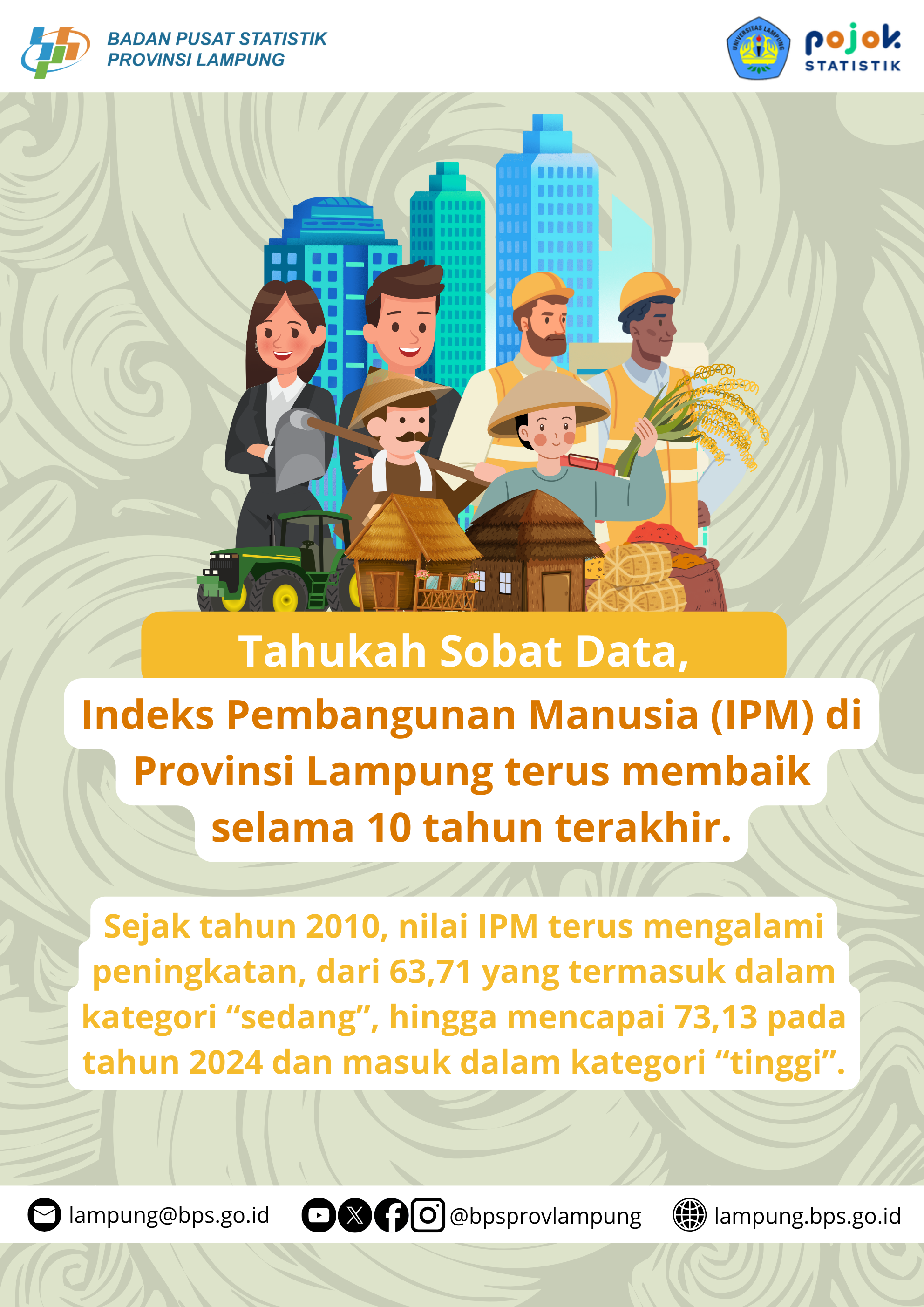 Infografis ini memaparkan potret kualitas hidup masyarakat Lampung secara ringkas, di mana terjadi peningkatan signifikan dalam Indeks Pembangunan Manusia (IPM) menjadi 72,48 di tahun 2023,...