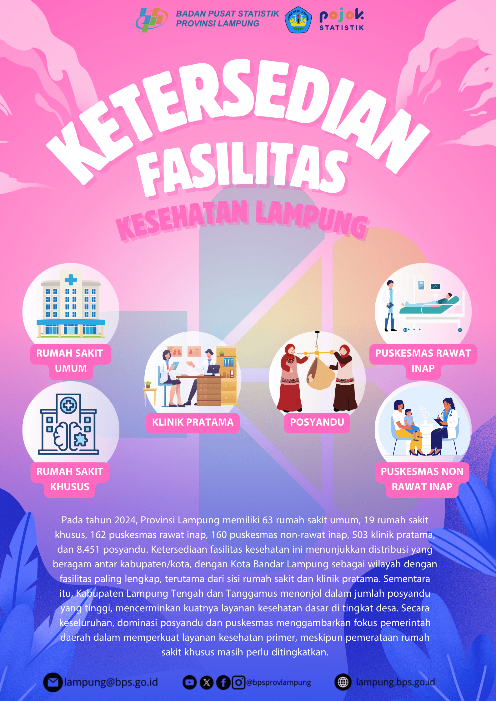 Pada tahun 2024, Provinsi Lampung memiliki 63 rumah sakit umum, 19 rumah sakit khusus, 162 puskesmas rawat inap, 160 puskesmas non-rawat inap, 503 klinik pratama,...