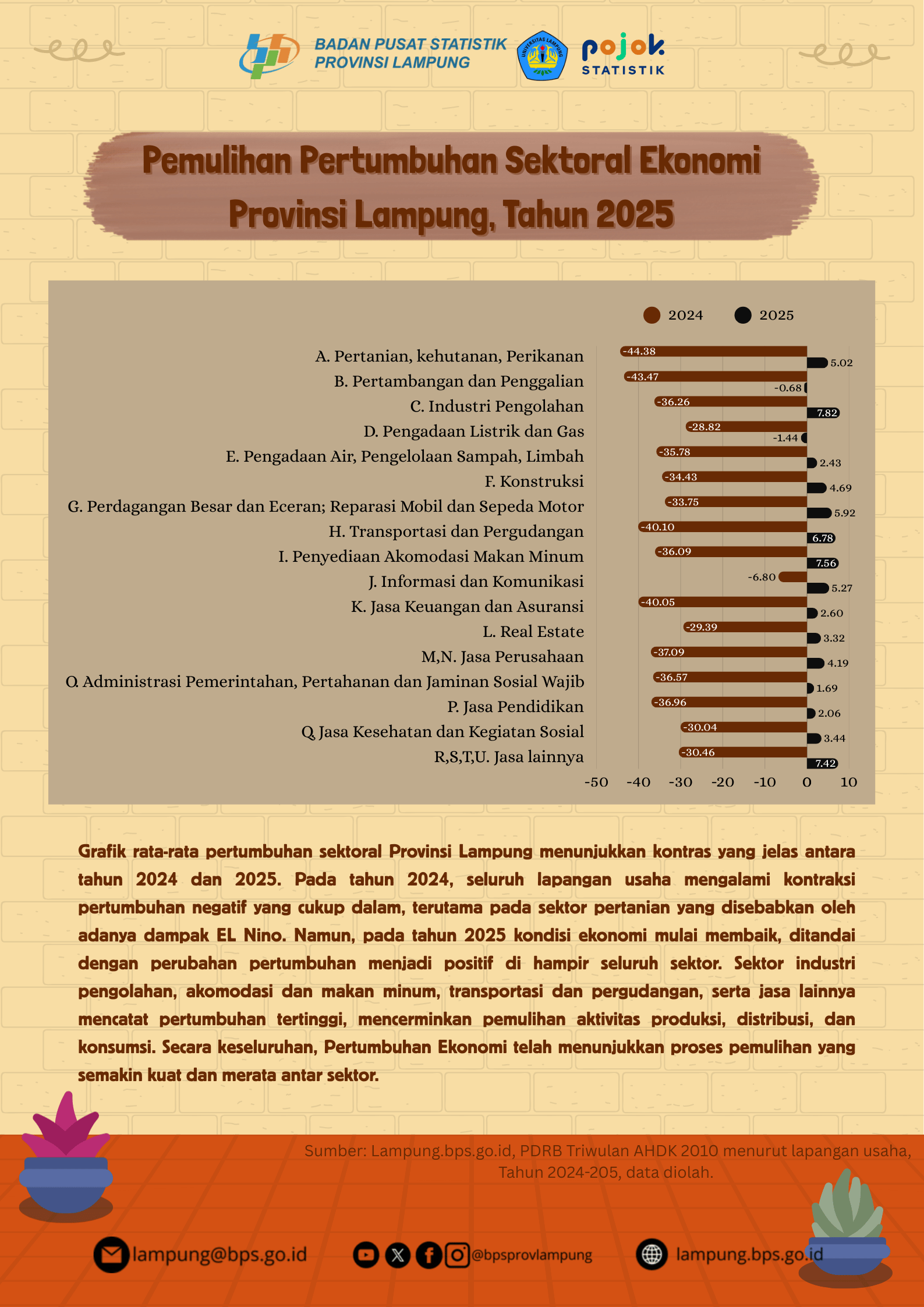 Grafik rata-rata pertumbuhan sektoral Provinsi Lampung menunjukkan kontras yang jelas antara tahun 2024 dan 2025. Pada tahun 2024, seluruh lapangan usaha mengalami kontraksi pertumbuhan negatif...