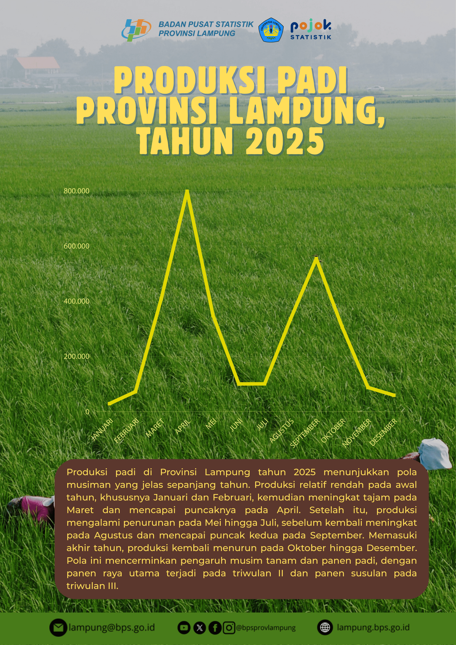 Produksi padi di Provinsi Lampung tahun 2025 menunjukkan pola musiman yang jelas sepanjang tahun. Produksi relatif rendah pada awal tahun, khususnya Januari dan Februari, kemudian...