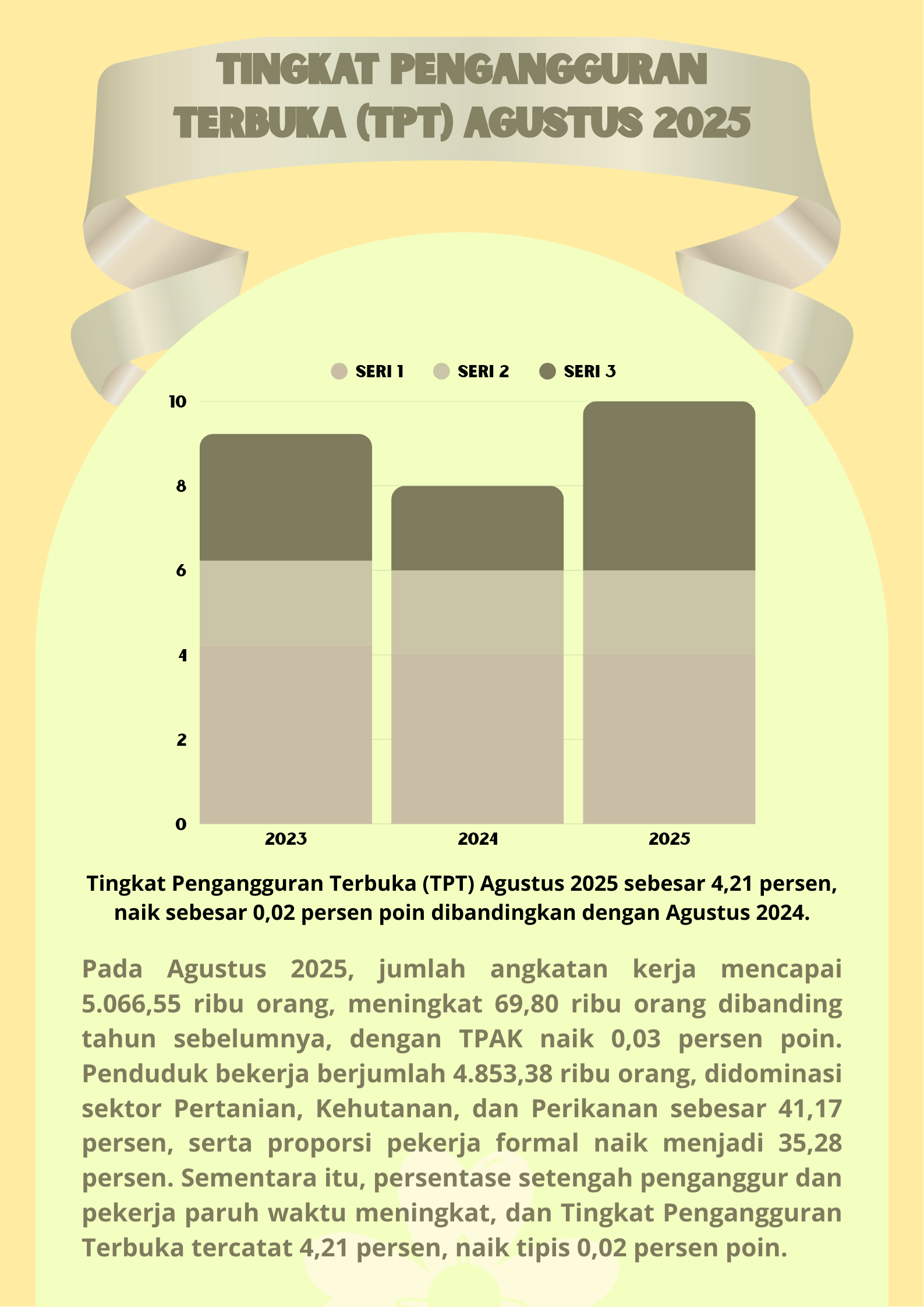 Tingkat Pengangguran Terbuka (TPT) tercatat sebesar 4,21 persen, naik tipis 0,02 persen poin dibanding Agustus 2024. Jumlah angkatan kerja mencapai 5.066,55 ribu orang dengan peningkatan...