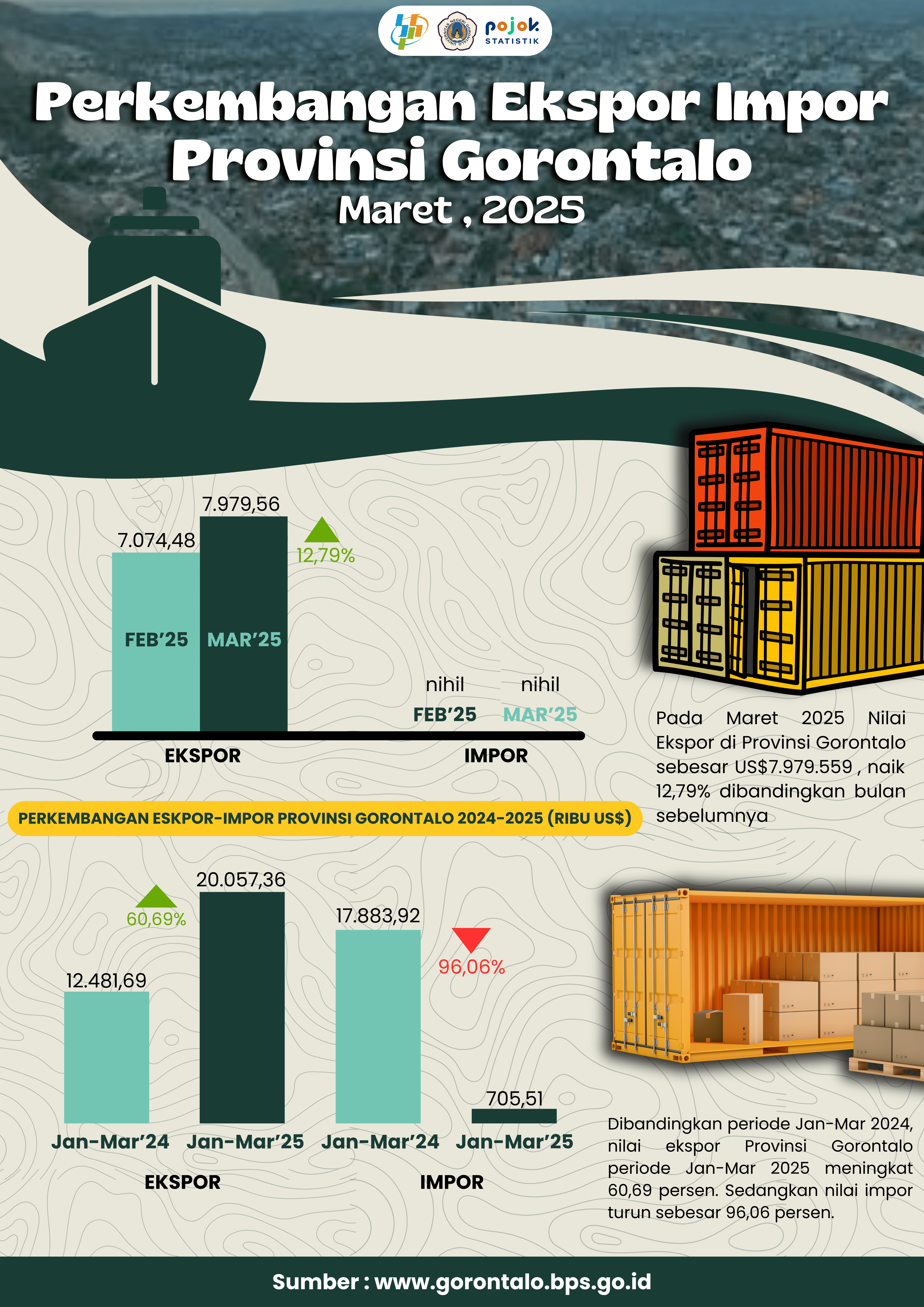 📦🌍 Ekspor-Impor Gorontalo Maret 2025: Ekspor Naik, Impor Tetap Nihil! 📈❌ Nilai ekspor Gorontalo meningkat tajam di Maret 2025! 📦 Ekspor: US$7.979.559 (+12,79% dari Februari)...