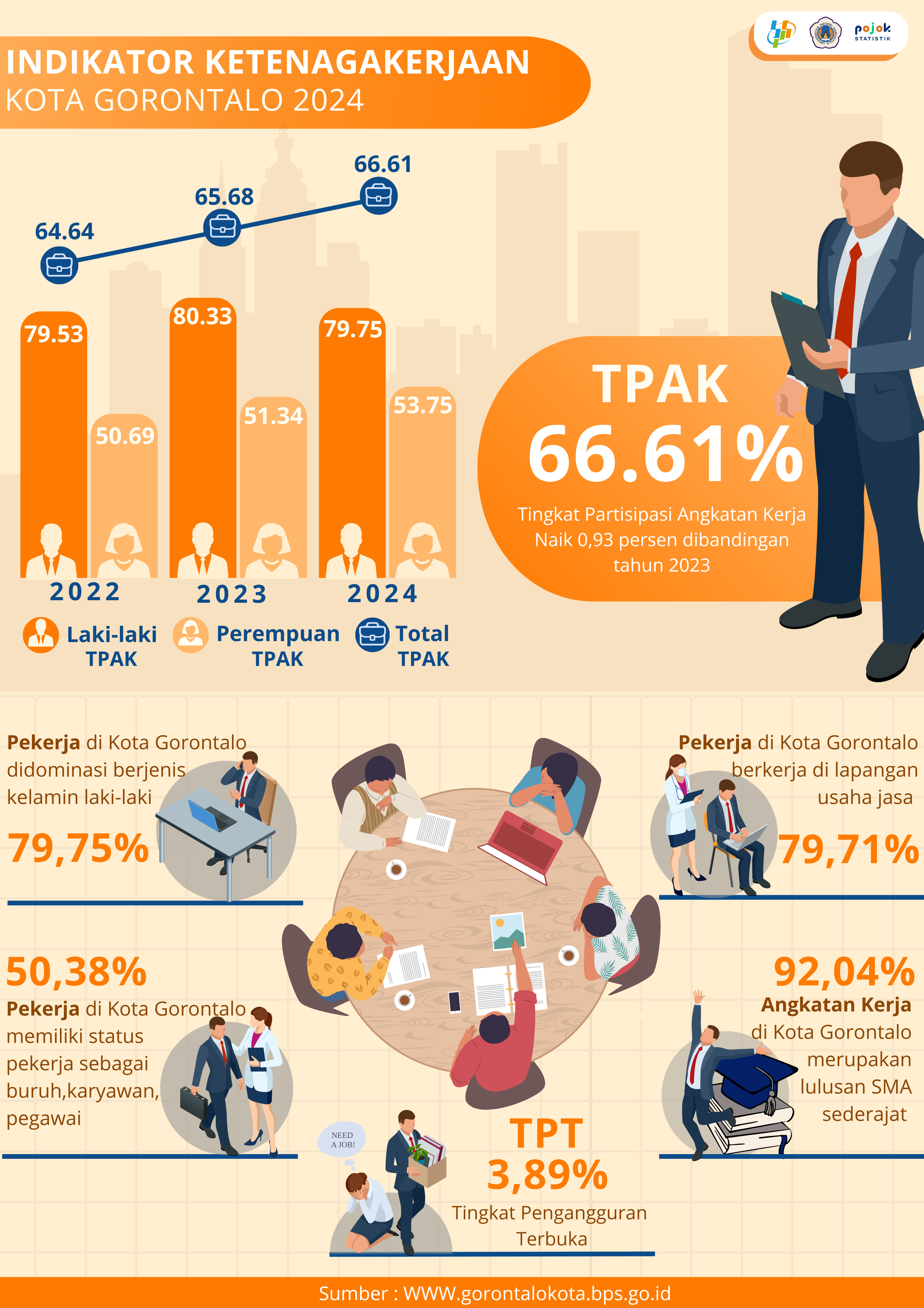 Tau kah kamu? Tingkat Partisipasi Angkatan Kerja (TPAK) di Kota Gorontalo tahun 2024 naik jadi 66,61%! 💼 Mayoritas pekerja adalah laki-laki (79,75%) dan sebagian besar...