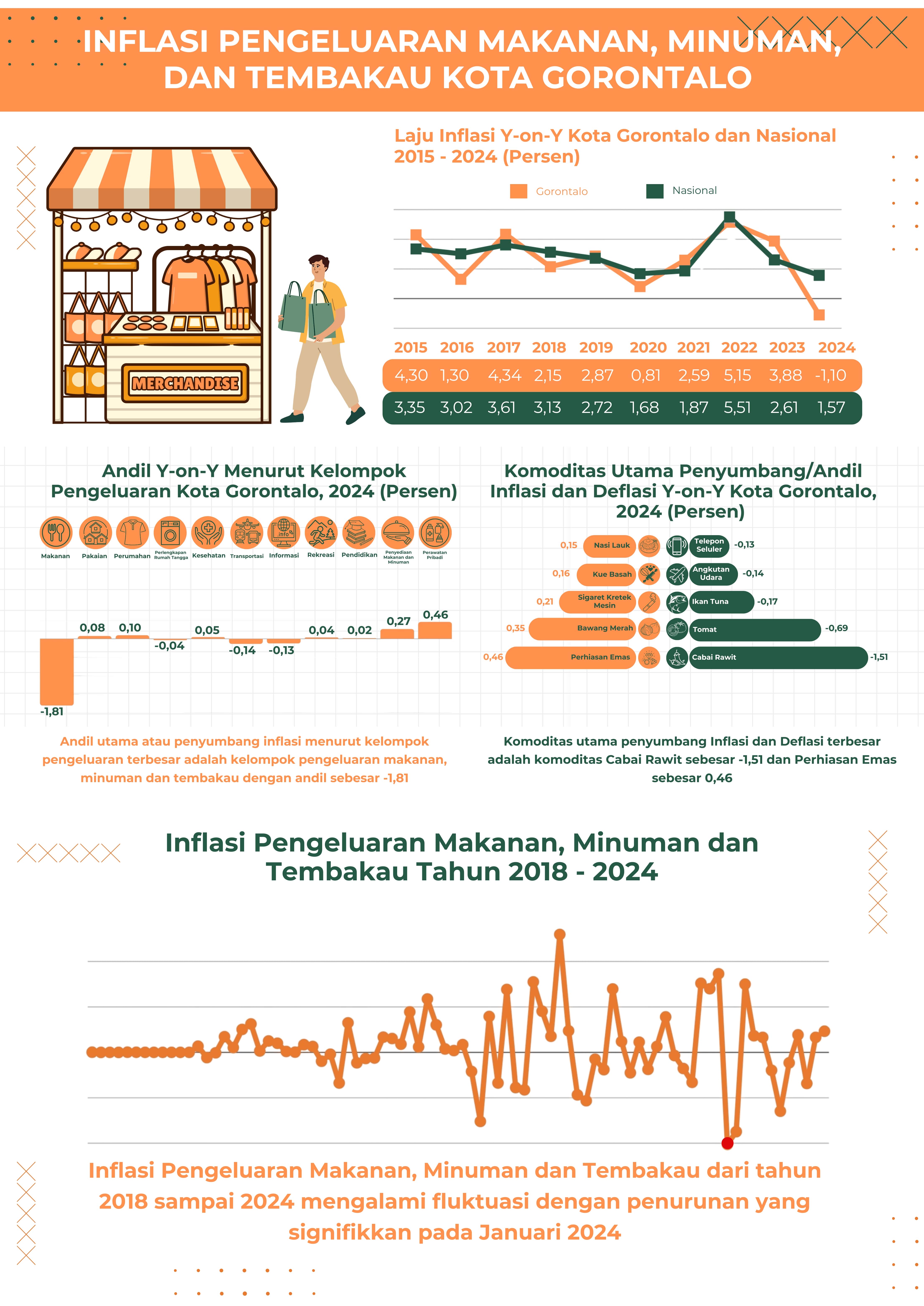 Infografis ini menunjukkan kondisi inflasi pengeluaran makanan, minuman, dan tembakau di Kota Gorontalo. Selama tahun 2024, kelompok ini menjadi penyumbang deflasi terbesar dengan andil -1,81%....