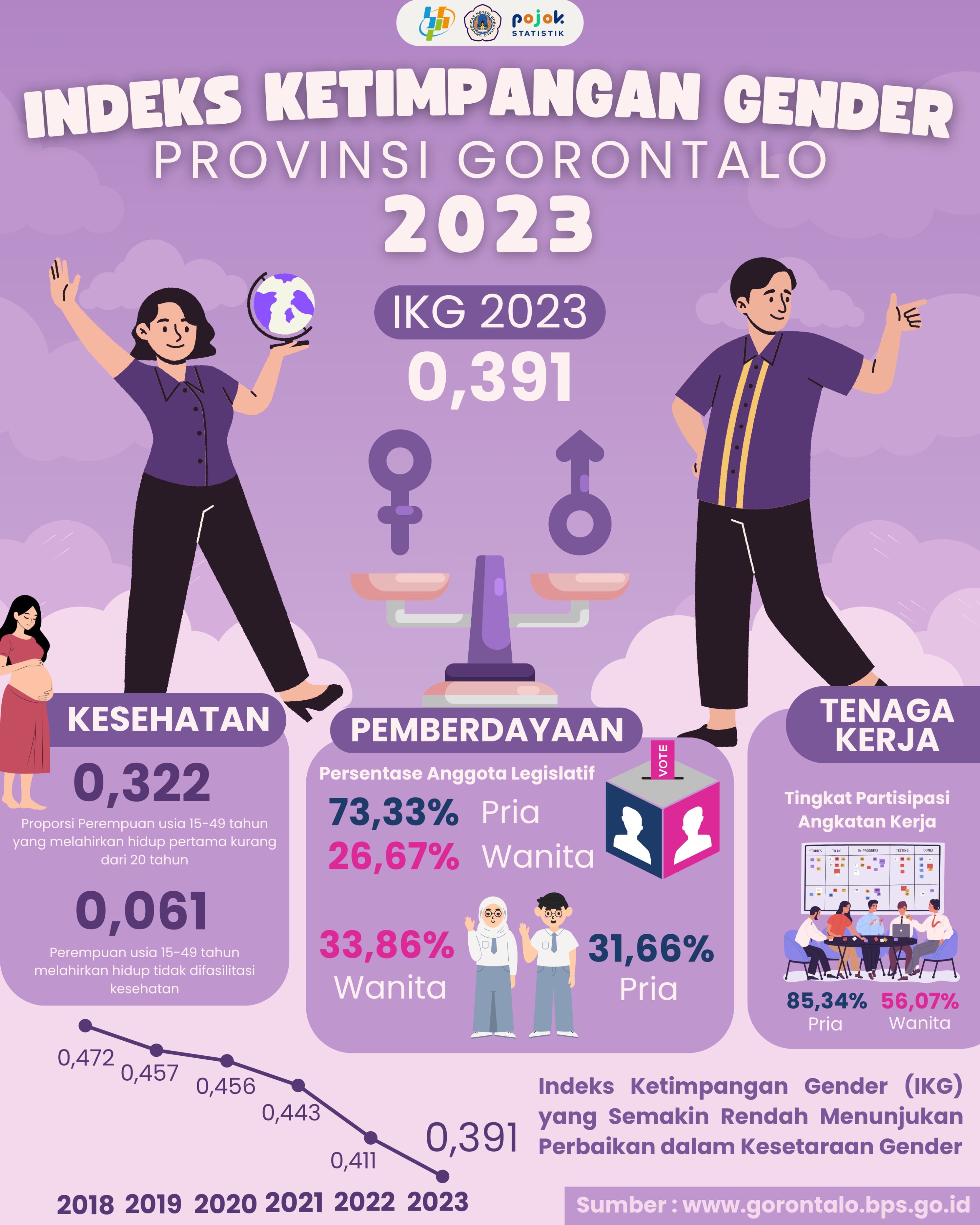 ⚖️👩💼 IKG Gorontalo 2023: Ketimpangan Gender Terus Menyusut! 📉✨ Tahun 2023, Indeks Ketimpangan Gender (IKG) Provinsi Gorontalo tercatat sebesar 0,391 — turun dari tahun 2022...