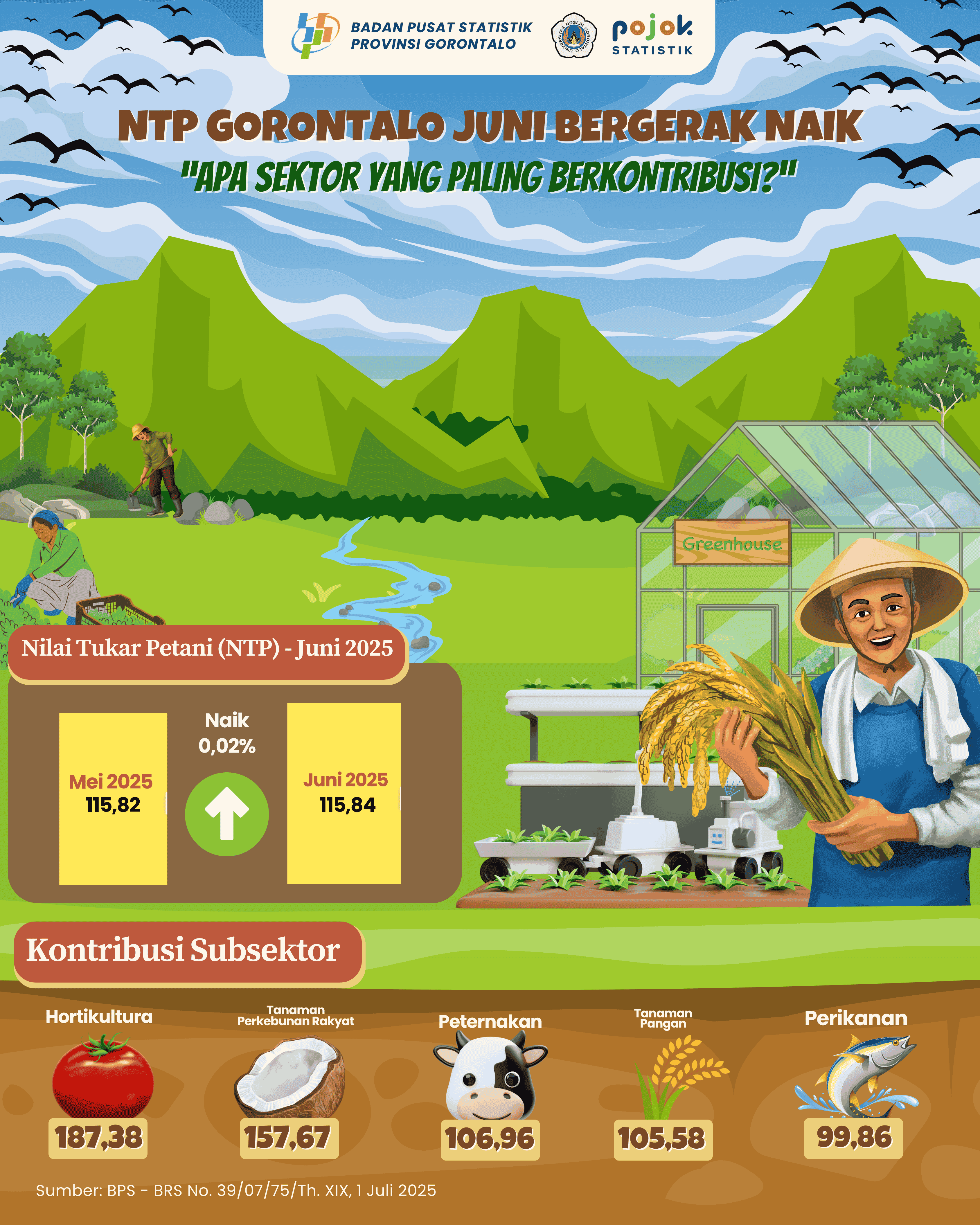 Nilai Tukar Petani (NTP) Provinsi Gorontalo pada Juni 2025 tercatat naik sebesar 0,02%, dari 115,82 (Mei) menjadi