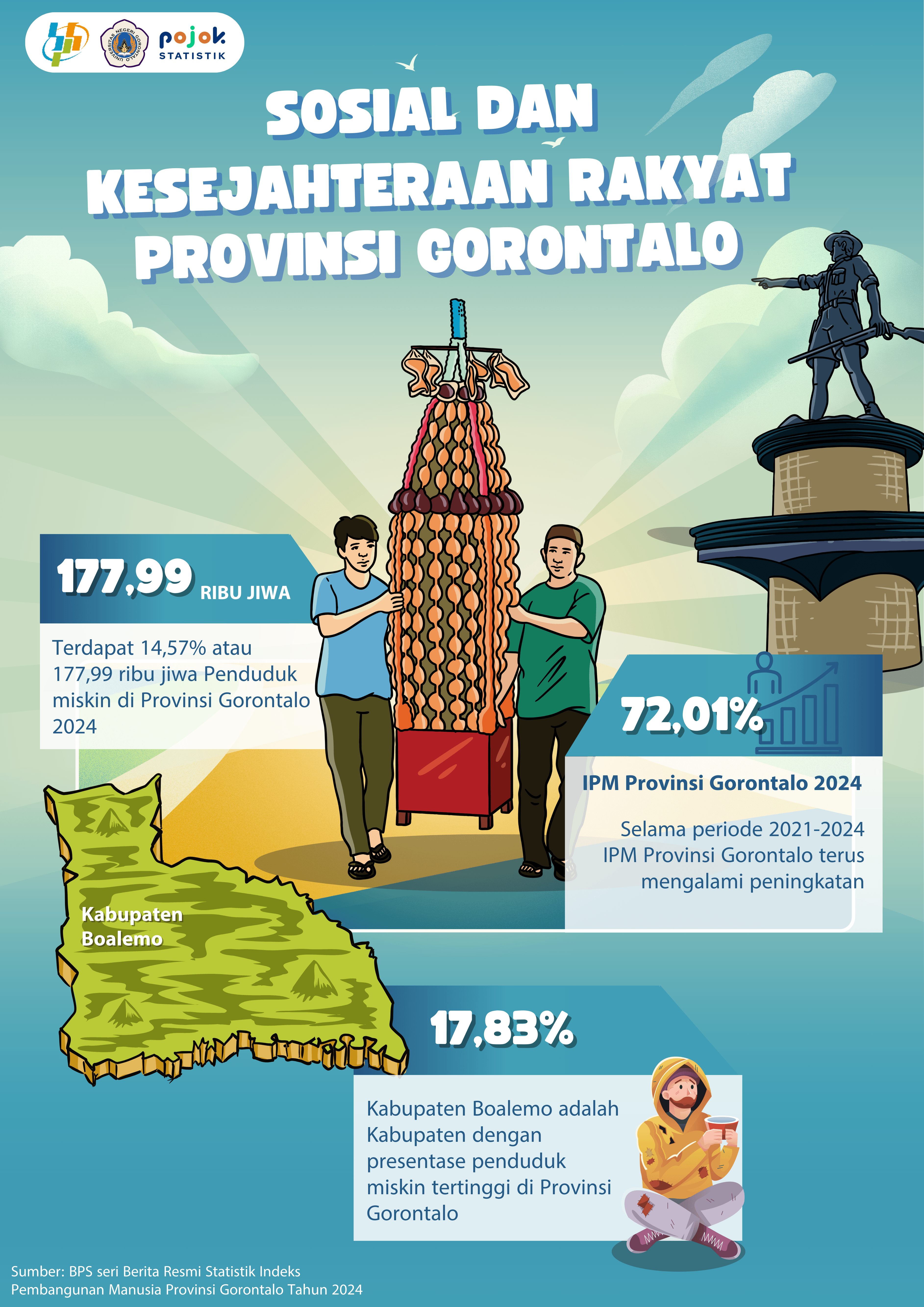 Indeks Pembangunan Manusia (IPM) Provinsi Gorontalo tahun 2024 mencapai 72,01 meningkat 0,76 poin (1,07 persen) dibandingkan tahun sebelumnya (71,25)