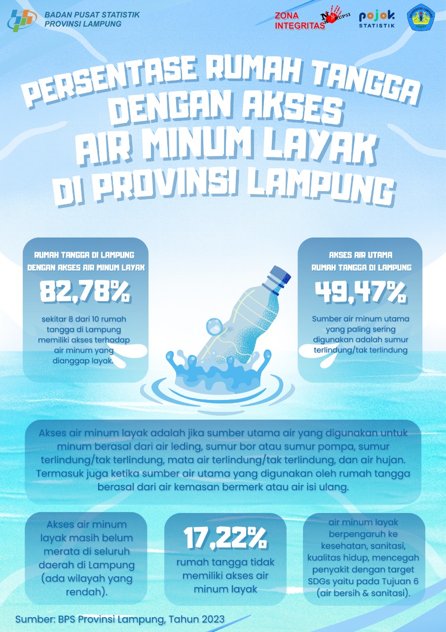 Sebanyak 82,78% rumah tangga di Provinsi Lampung telah memiliki akses terhadap air minum layak pada tahun 2023. Artinya, sekitar 8 dari 10 rumah tangga di...