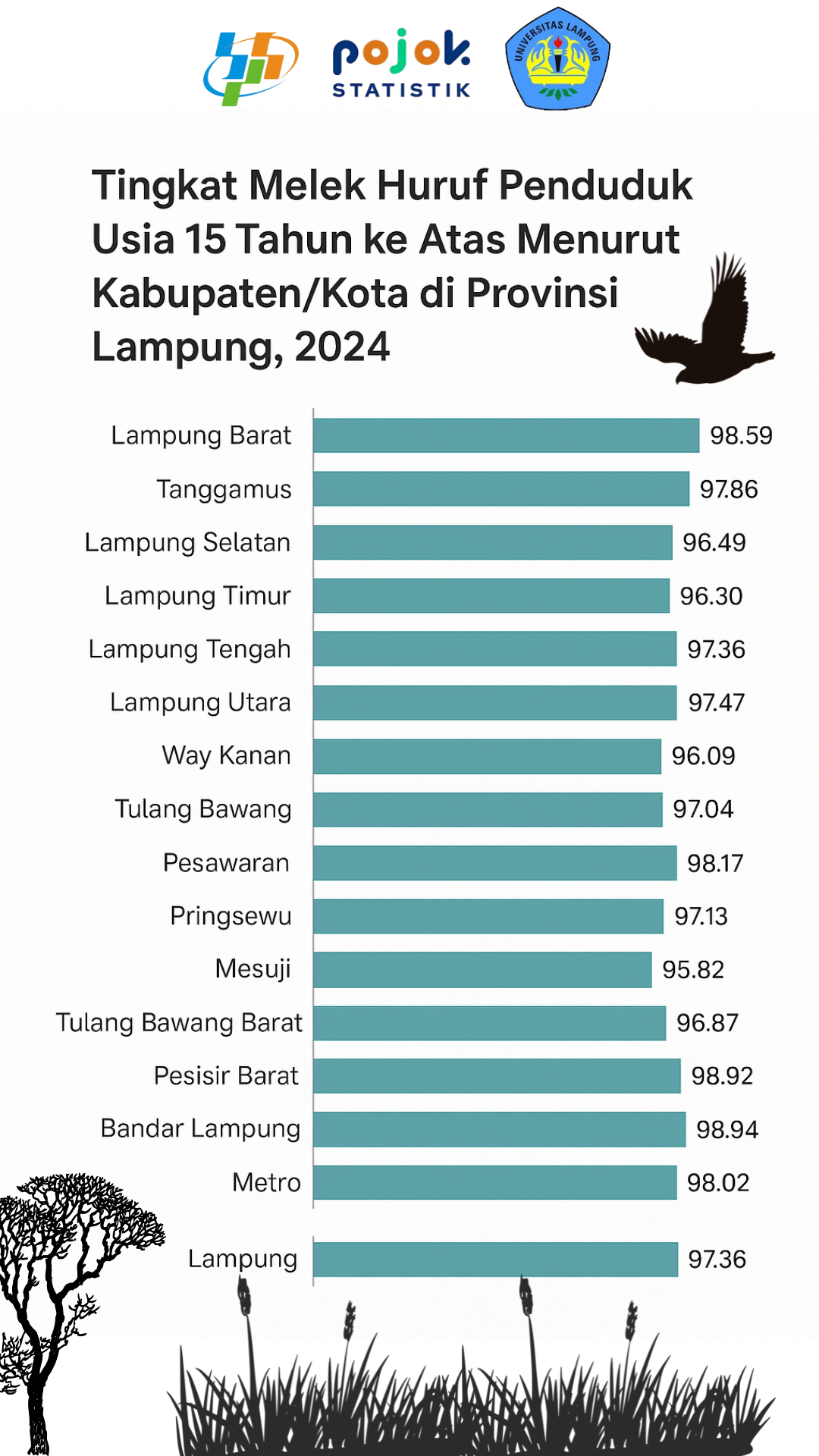 Informasi seberapa besar tingkat melek huruf usia 15 tahun ke atas di Kabupaten/Kota Provinsi Lampung pada tahun 2024