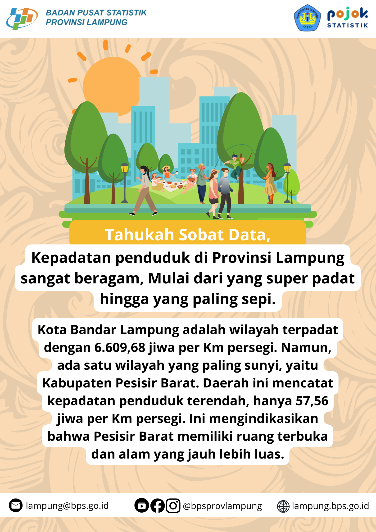 Kota Bandar Lampung adalah wilayah terpadat dengan 6.609,68 jiwa per Km persegi. Namun, ada satu wilayah yang paling sunyi, yaitu Kabupaten Pesisir Barat. Daerah ini...