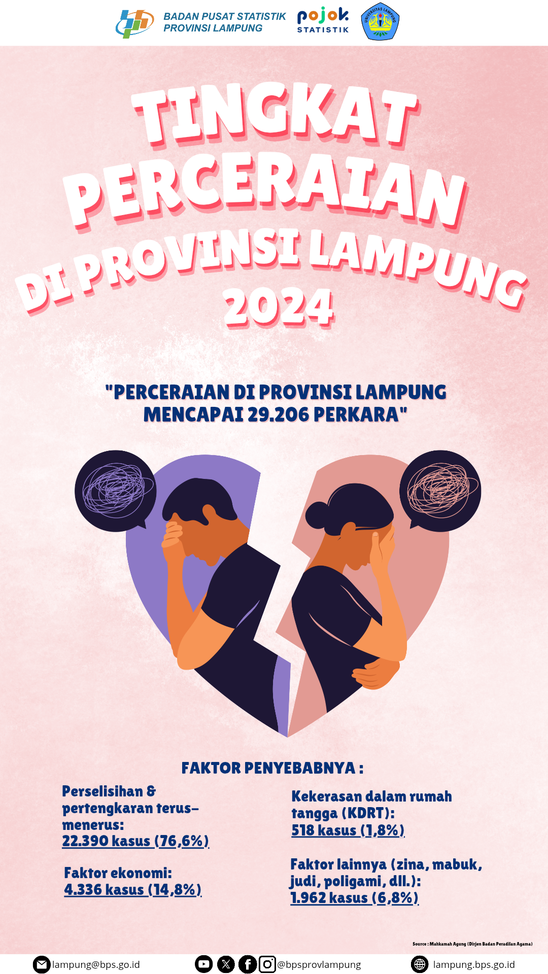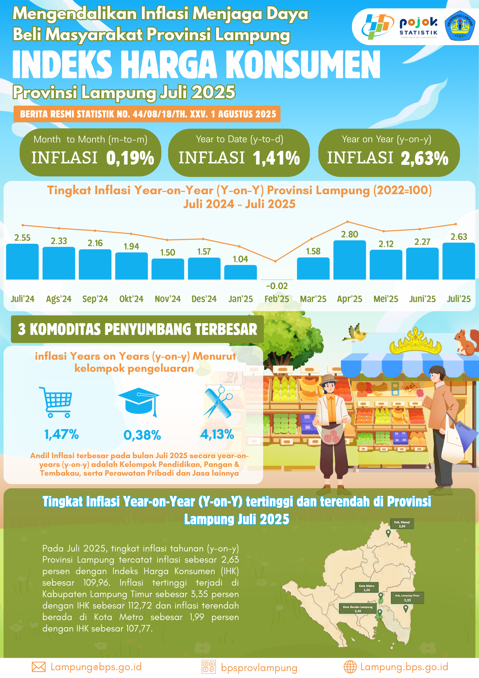 Pada Juli 2025, inflasi Provinsi Lampung tercatat sebesar 0,19 persen (m-to-m), 1,41 persen (y-to-d), dan 2,63 persen (y-on-y). Kelompok pengeluaran yang menjadi penyumbang inflasi terbesar...