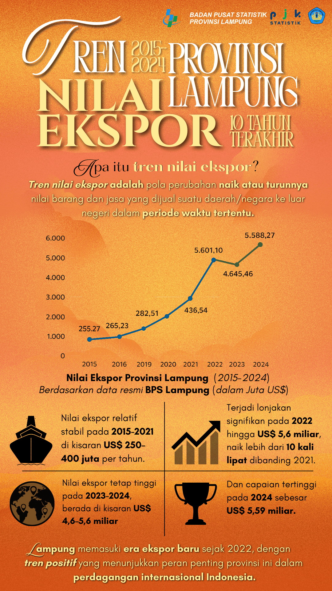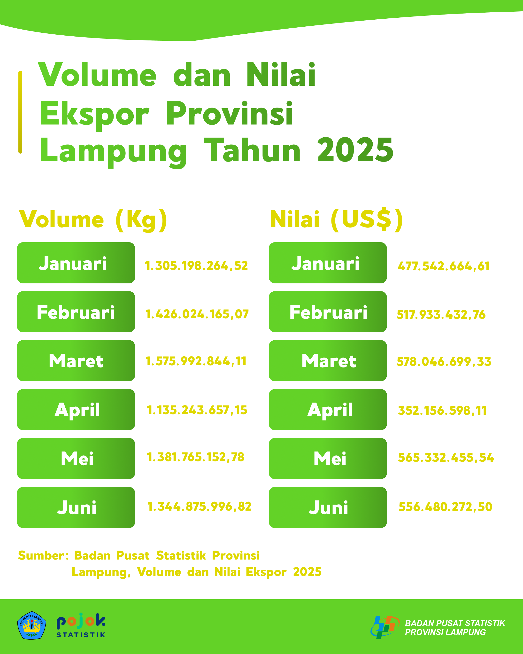 Berdasarkan data Badan Pusat Statistik Provinsi Lampung, tren ekspor Lampung sepanjang semester pertama 2025 menunjukkan pergerakan yang dinamis, baik dari sisi volume maupun nilai.