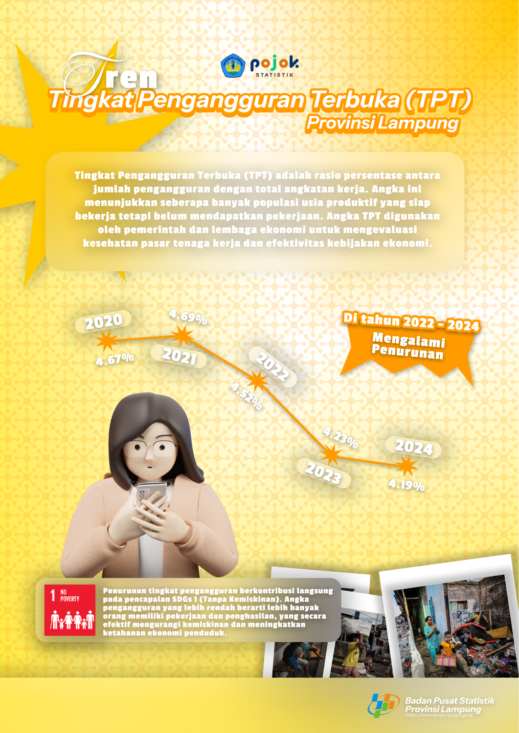 Tren Tingkat Pengangguran Terbuka (TPT) Provinsi Lampung periode 2020–2024. Data menunjukkan TPT cenderung menurun, dari 4,69% pada 2021 menjadi 4,19% pada 2024. Penurunan ini mendukung...