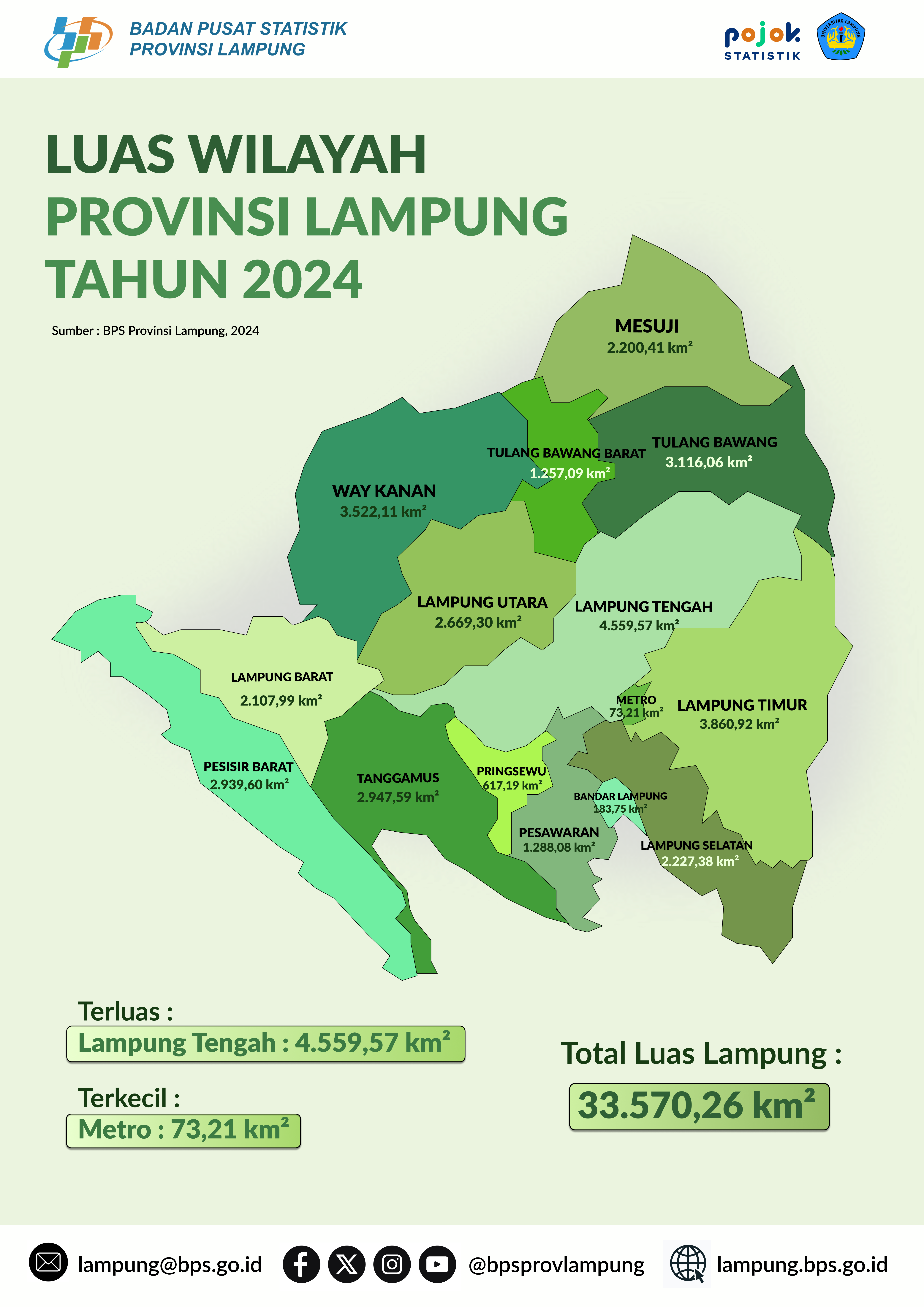 Berikut adalah Luas Wilayah Provinsi Lampung, Tahun 2024 Provinsi Lampung memiliki luas daratan 33.570,26 km² pada tahun 2024, yang terbagi ke dalam 13 kabupaten dan...
