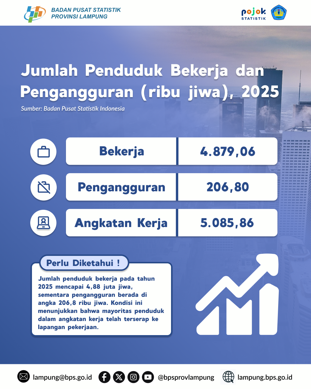 Jumlah penduduk bekerja pada tahun 2025 mencapai 4,88 juta jiwa, sementara pengangguran berada di angka 206,8 ribu jiwa. Kondisi ini menunjukkan bahwa mayoritas penduduk dalam...