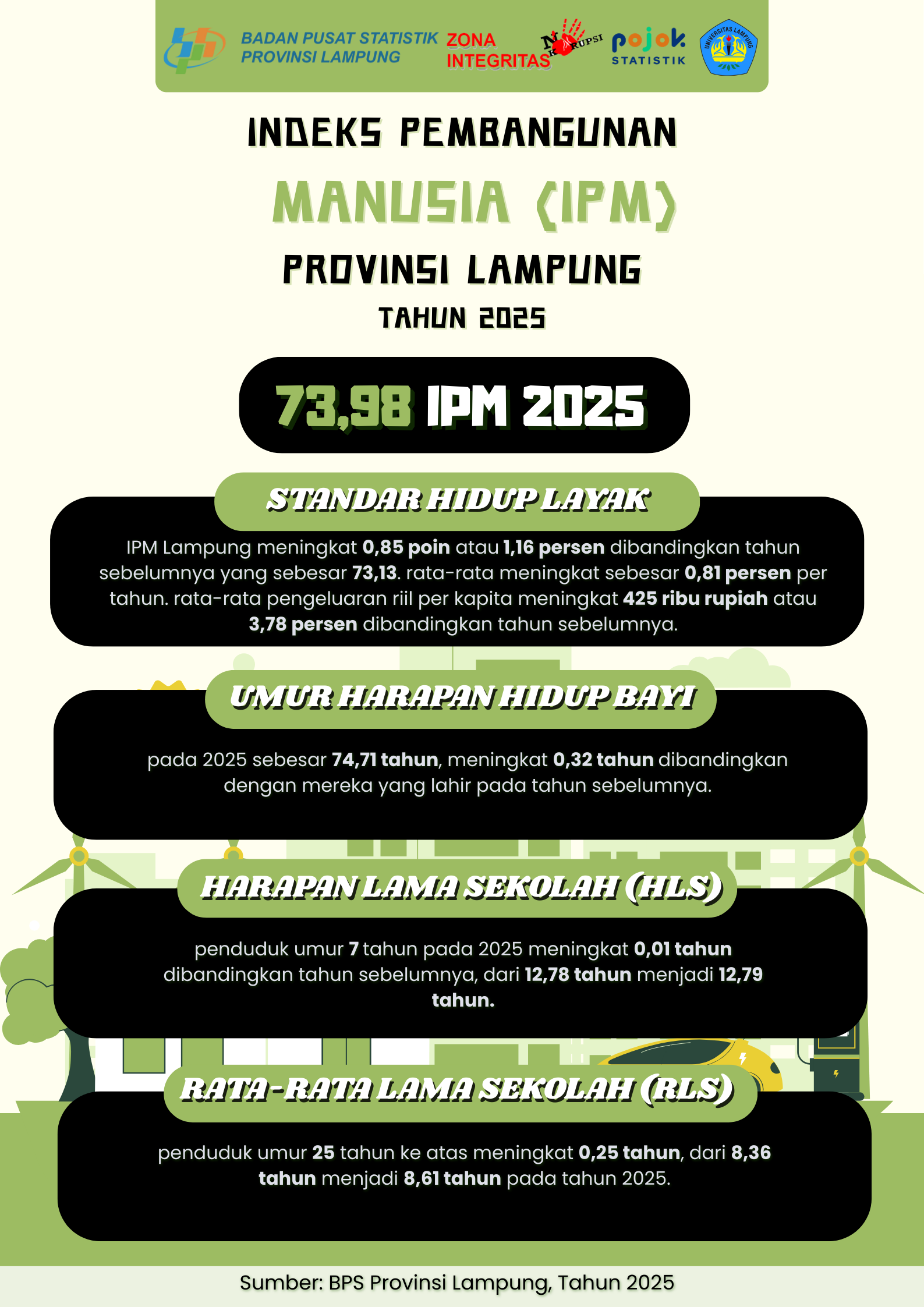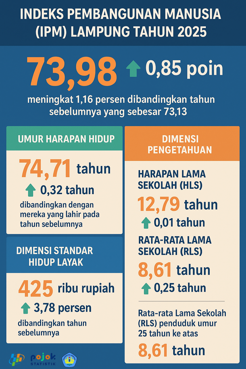 Infografis ini menyajikan perkembangan Indeks Pembangunan Manusia (IPM) Provinsi Lampung tahun 2025 yang dirilis oleh BPS Provinsi Lampung. Pada tahun 2025, IPM Lampung tercatat 73,98,...