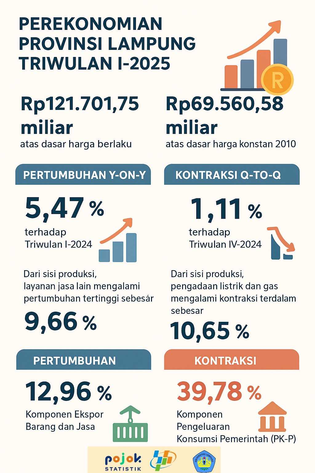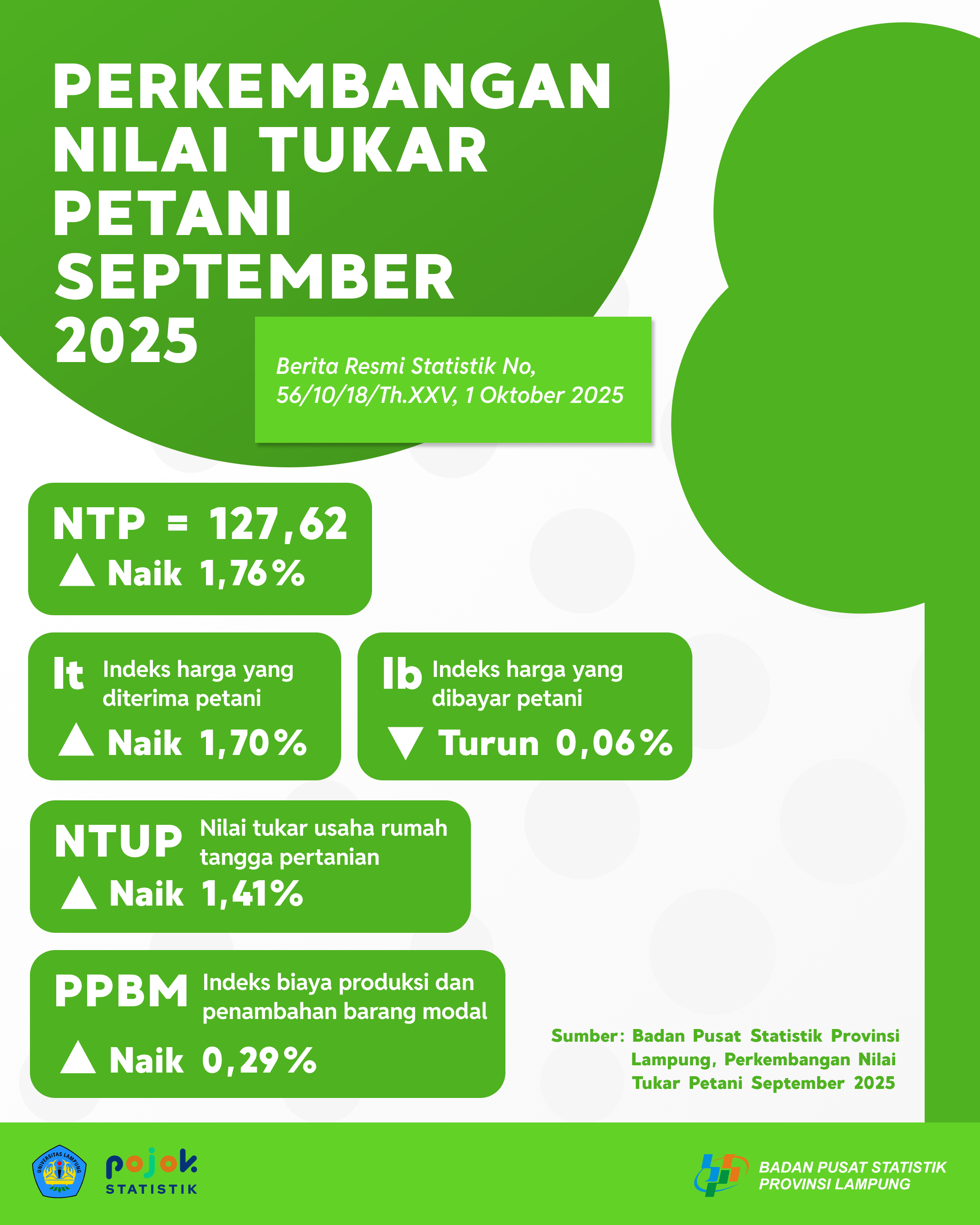 Infografis ini menunjukkan bahwa Nilai Tukar Petani (NTP) Lampung pada September 2025 naik menjadi 127,62. Kenaikan terjadi karena meningkatnya harga yang diterima petani dan turunnya...