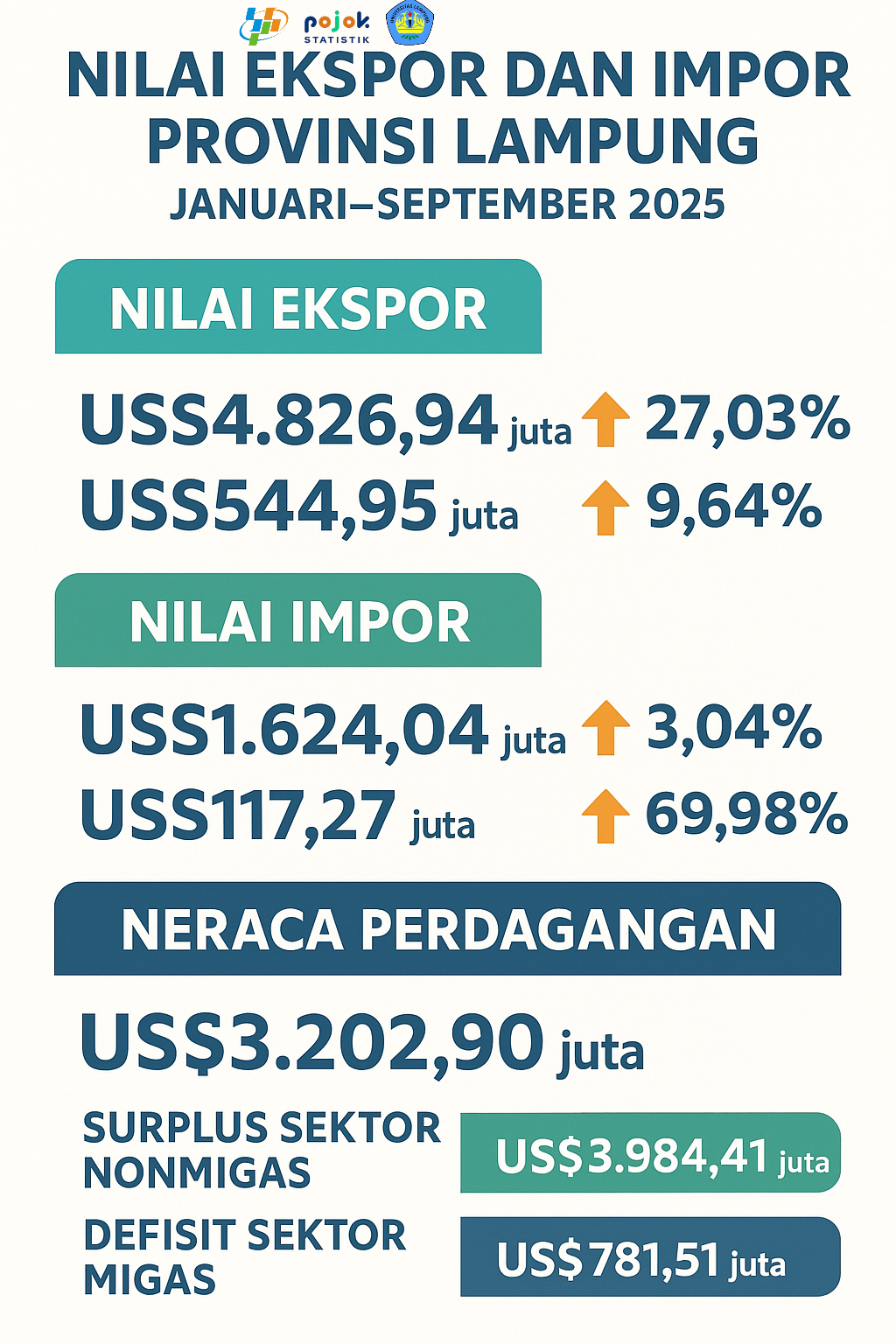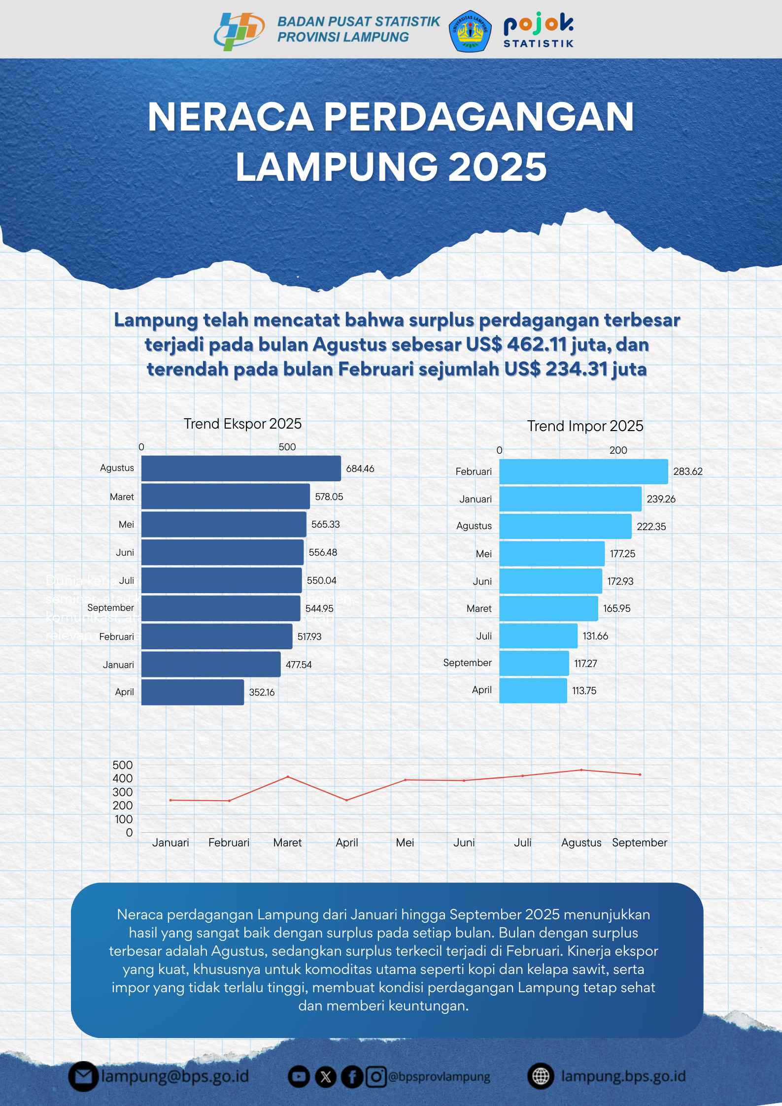 Neraca perdagangan Lampung dari Januari hingga September 2025 menunjukkan hasil yang sangat baik dengan surplus pada setiap bulan. Bulan dengan surplus terbesar adalah Agustus, sedangkan...