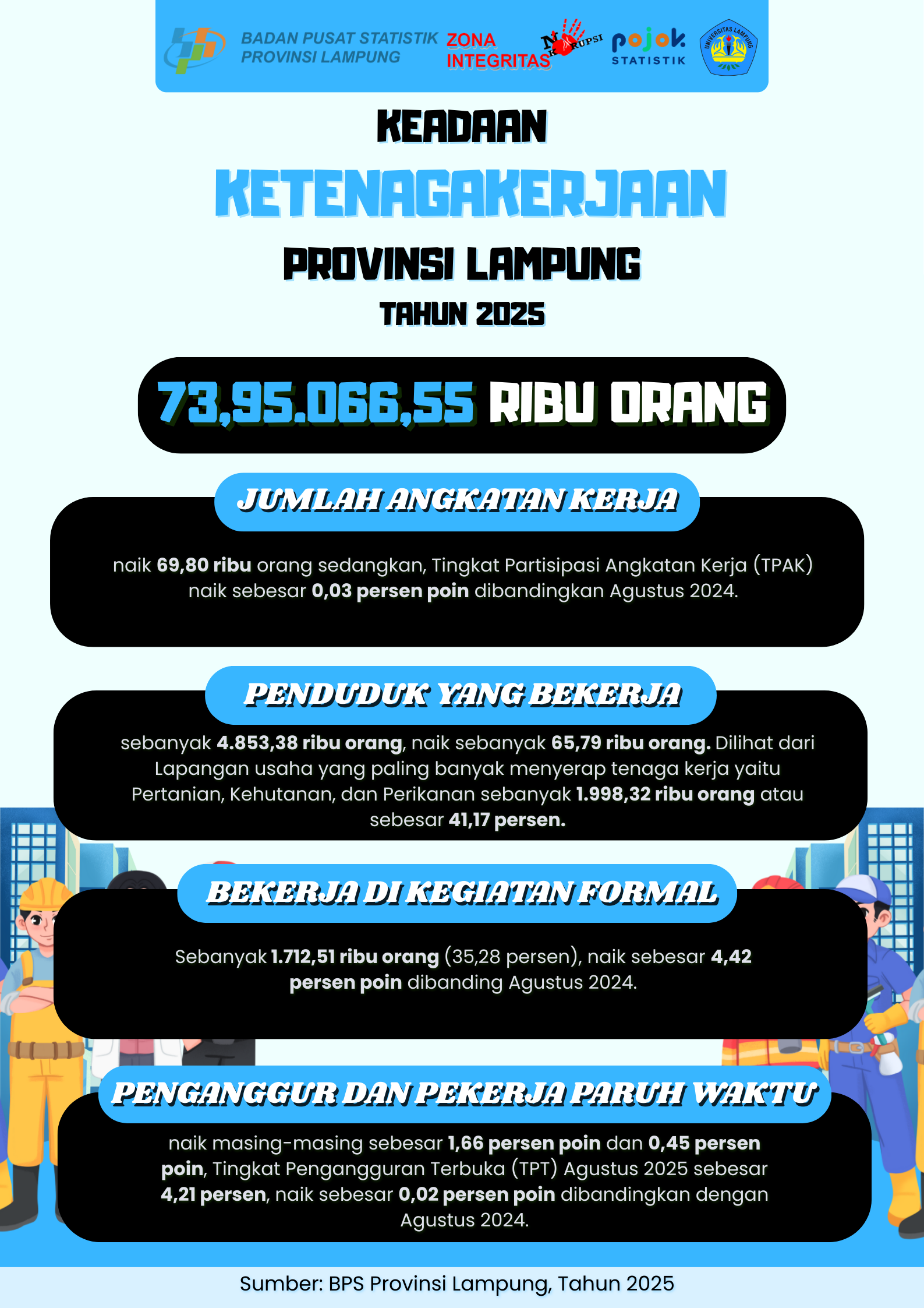 Infografis ini menampilkan gambaran umum keadaan ketenagakerjaan Provinsi Lampung tahun 2025 berdasarkan data BPS Provinsi Lampung. Total penduduk usia kerja yang tergolong dalam ketenagakerjaan tercatat...