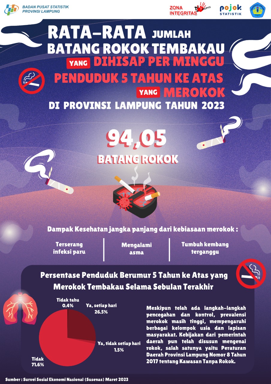 Pada tahun 2023 tercatat persentase penduduk berumur 5 tahun ke atas yang merokok tembakau setiap hari selama sebulan terakhir sebesar 26,49 persen dan merokok tidak...