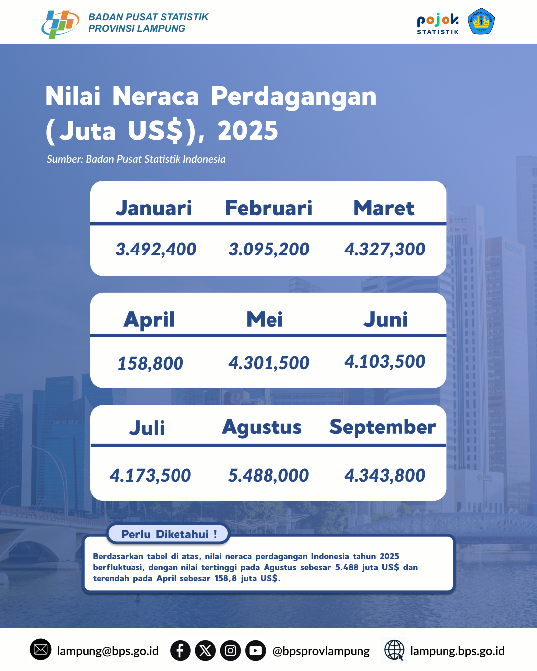 Berdasarkan tabel di atas, nilai neraca perdagangan Indonesia tahun 2025 berfluktuasi, dengan nilai tertinggi pada Agustus sebesar 5.488 juta US$ dan terendah pada April sebesar...