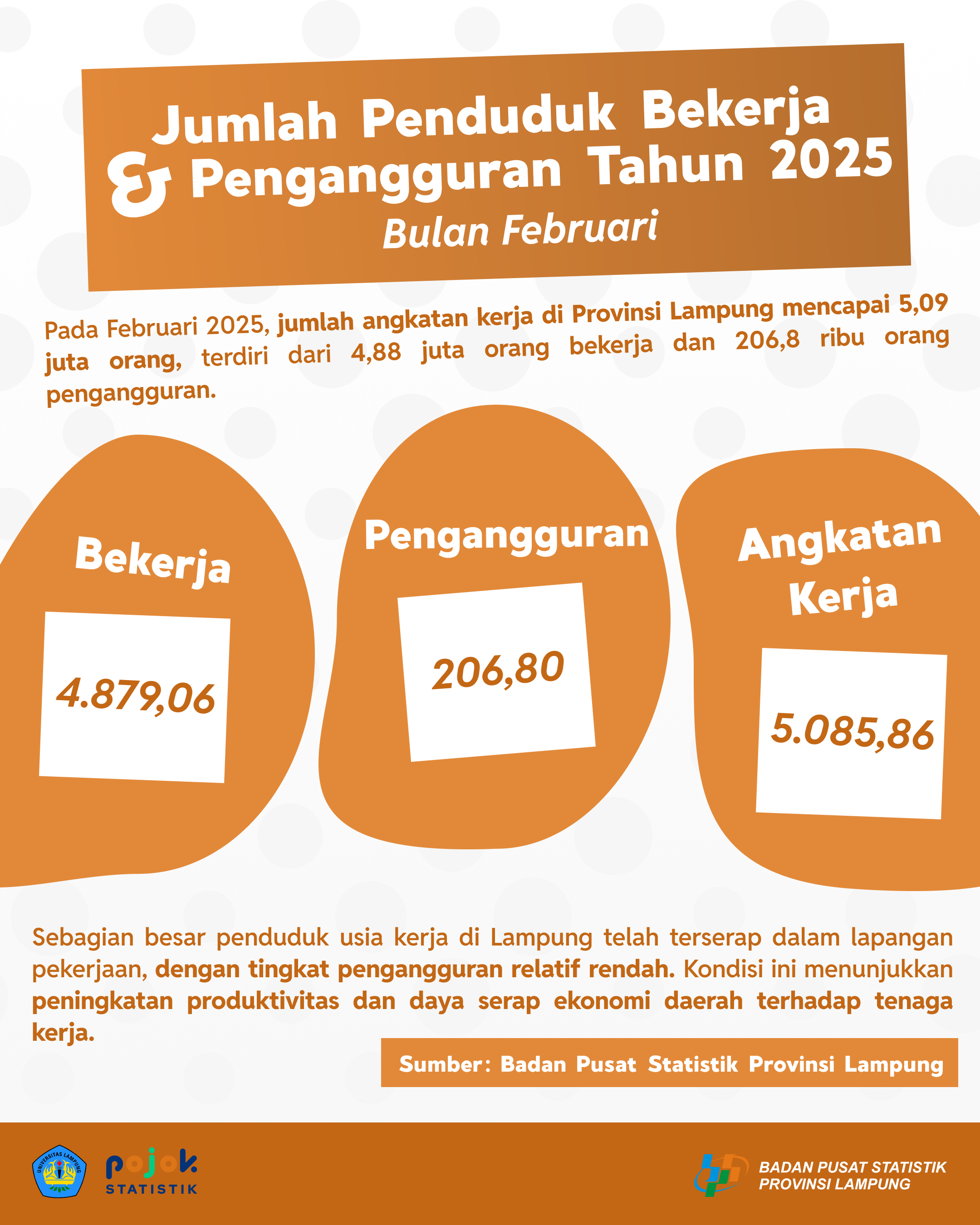Pada Februari 2025, jumlah angkatan kerja di Provinsi Lampung mencapai 5,09 juta orang, terdiri dari 4,88 juta penduduk bekerja dan 206,8 ribu pengangguran. Sebagian besar...