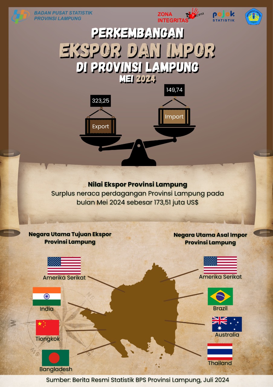 Nilai ekspor Provinsi Lampung pada Mei 2024 mencapai US$323,25 juta, lebih tinggi dari nilai impor Mei 2024 yang sebesar US$149,74 juta. Kondisi ini menjelaskan bahwa...
