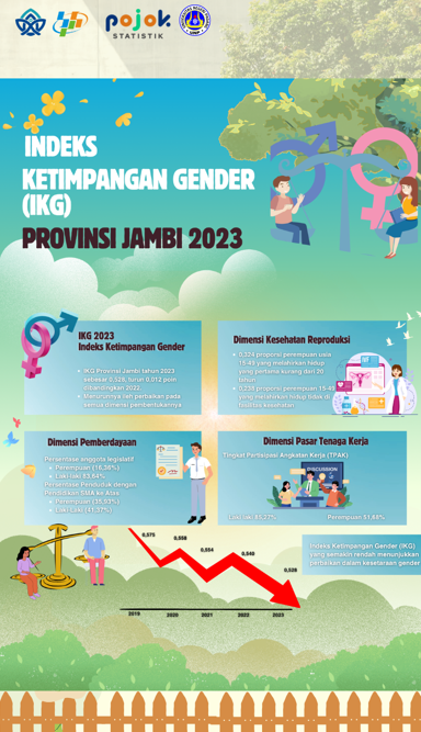 Infografis ini menjelaskan tentang kondisi Indeks Ketimpangan Gender Jambi Tahun 2023. Disajikan menurut penyusun Indeks Ketimpangan Gender selama periode 2023