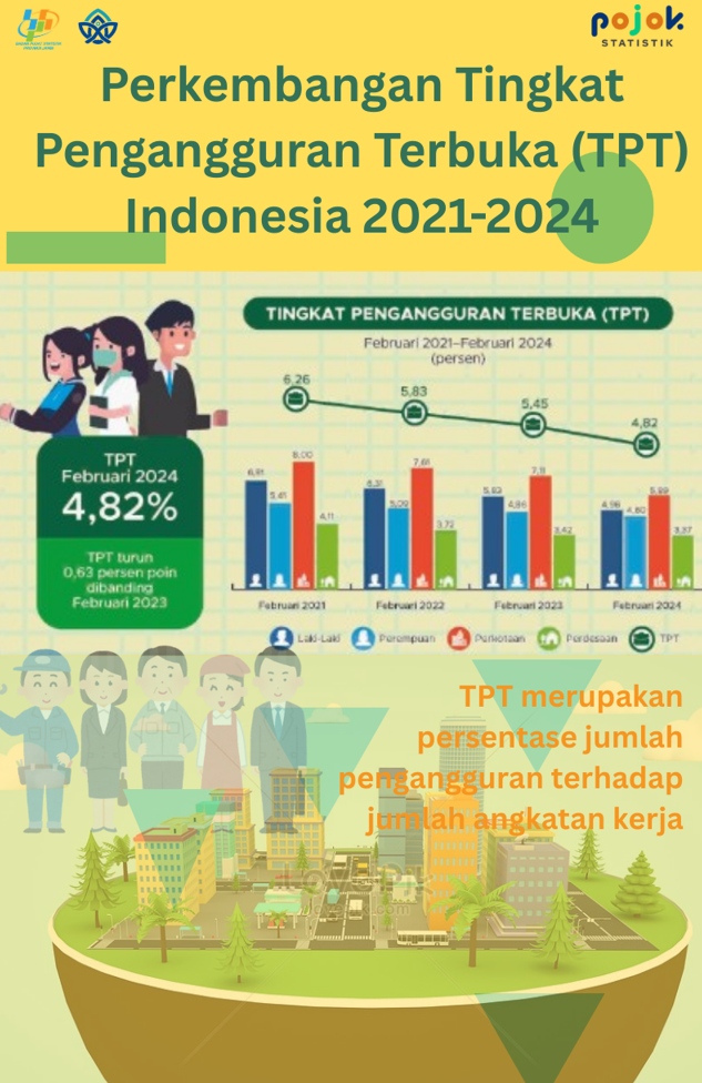 Infografis menyajikan perkembangan Tingkat Pengangguran Terbuka (TPT) Indonesia pada rentang waktu 2021-2024. Pada tahun 2024 TPT Indonesia menyentuh angka 4,82, lebih rendah dibanding 2023.