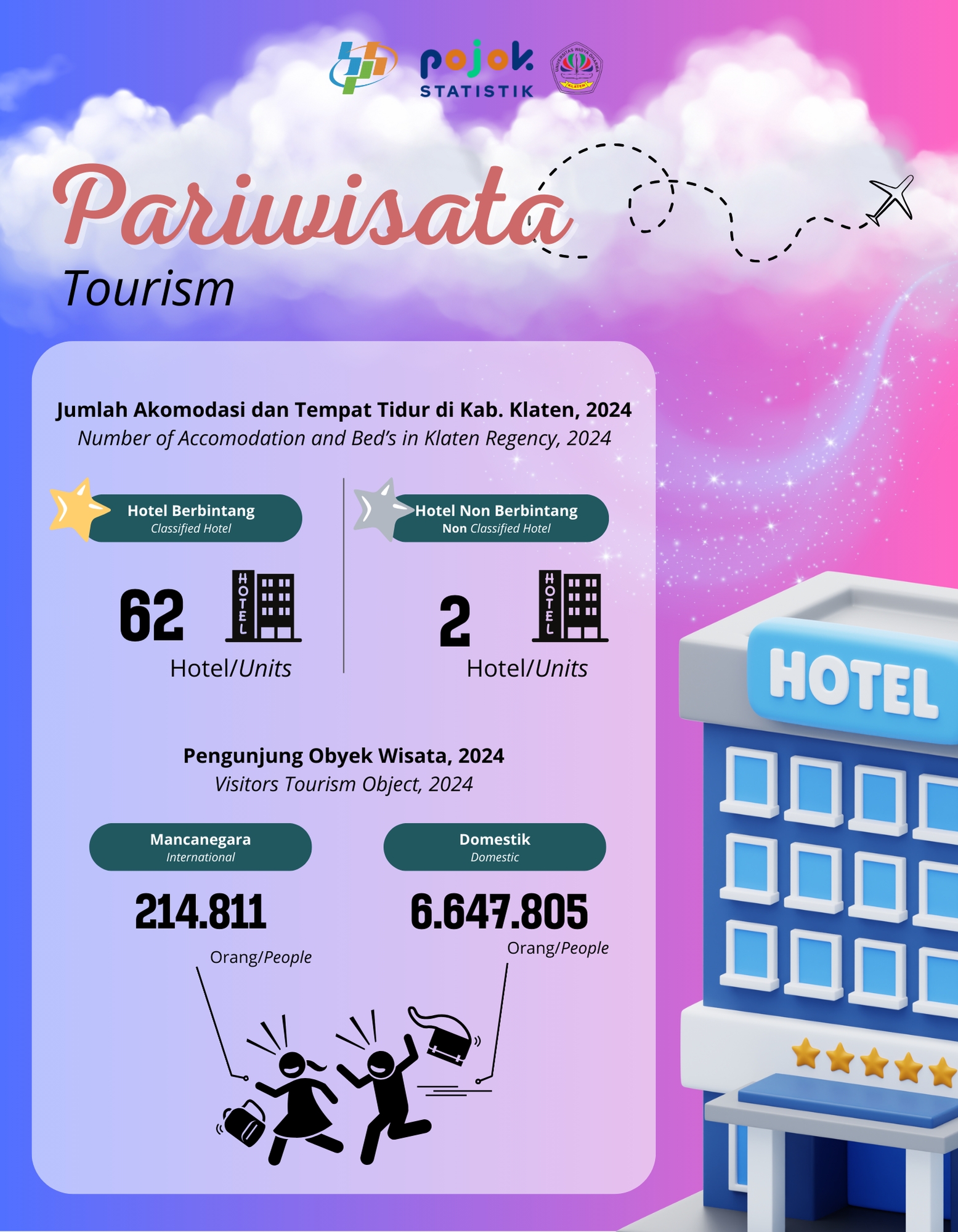 Jumlah hotel berbintang Kabupaten Klaten tahun 2024 sebanyak 2 hotel dan non bintang sebanyak 62 hotel.
