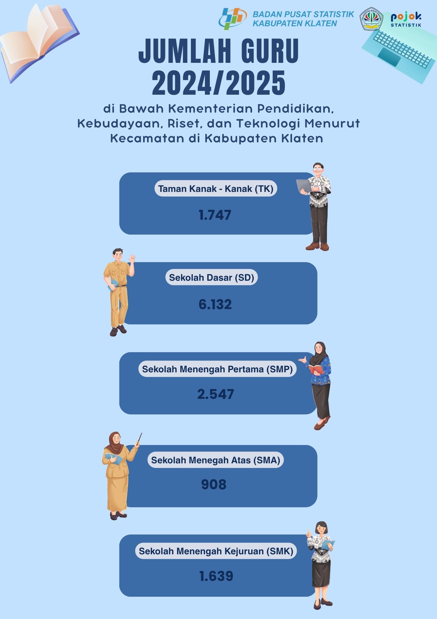 Jumlah Guru Menurut Jenjang Pendidikan di Bawah Kementerian Pendidikan, Kebudayaan, Riset, dan Teknologi Menurut Kecamatan di Kabupaten Klaten Tahun Ajaran 2024/2025