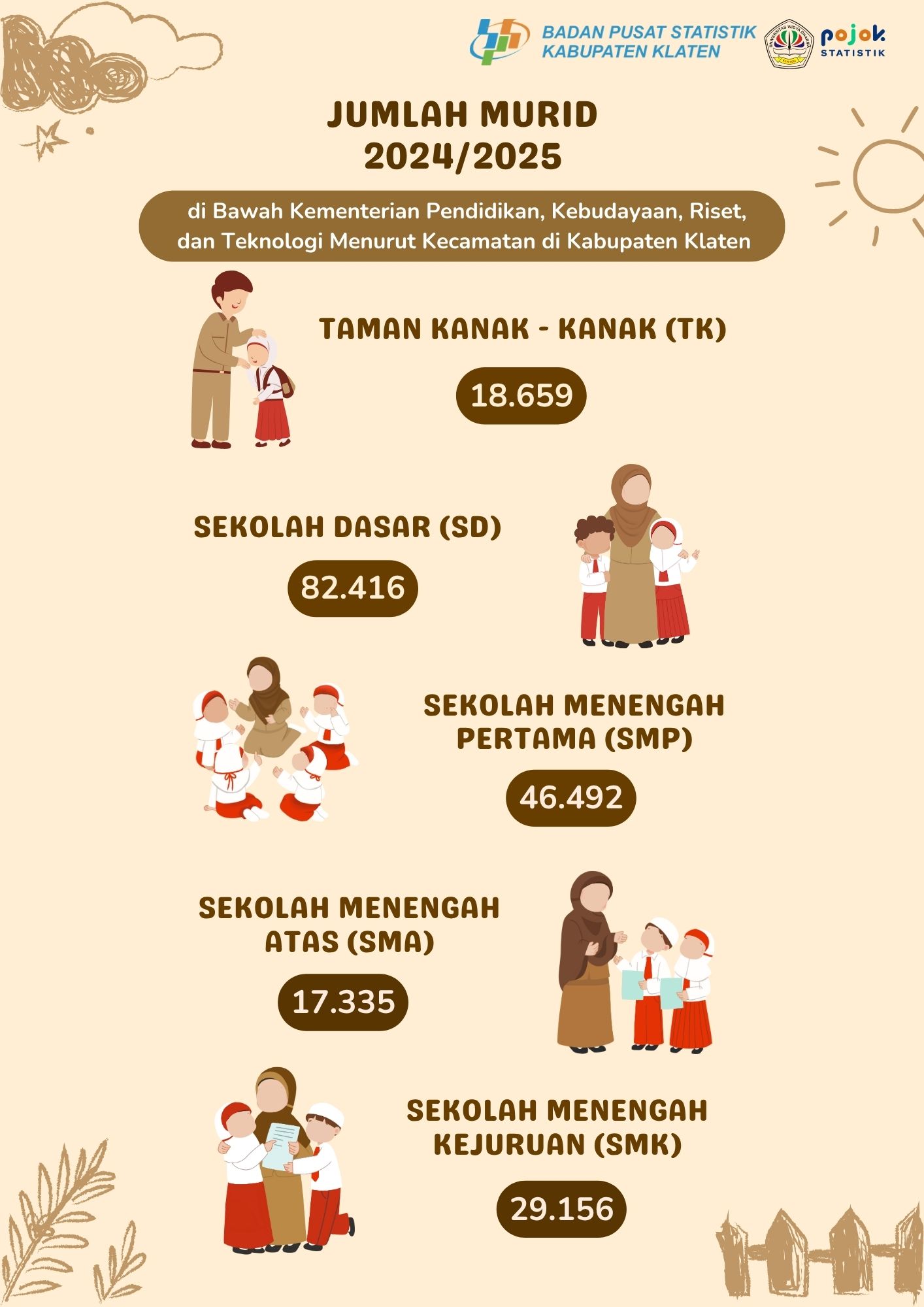 Jumlah Murid Menurut Jenjang Pendidikan di Bawah Kementerian Pendidikan, Kebudayaan, Riset, dan Teknologi Menurut Kecamatan di Kabupaten Klaten Tahun Ajaran 2024/2025