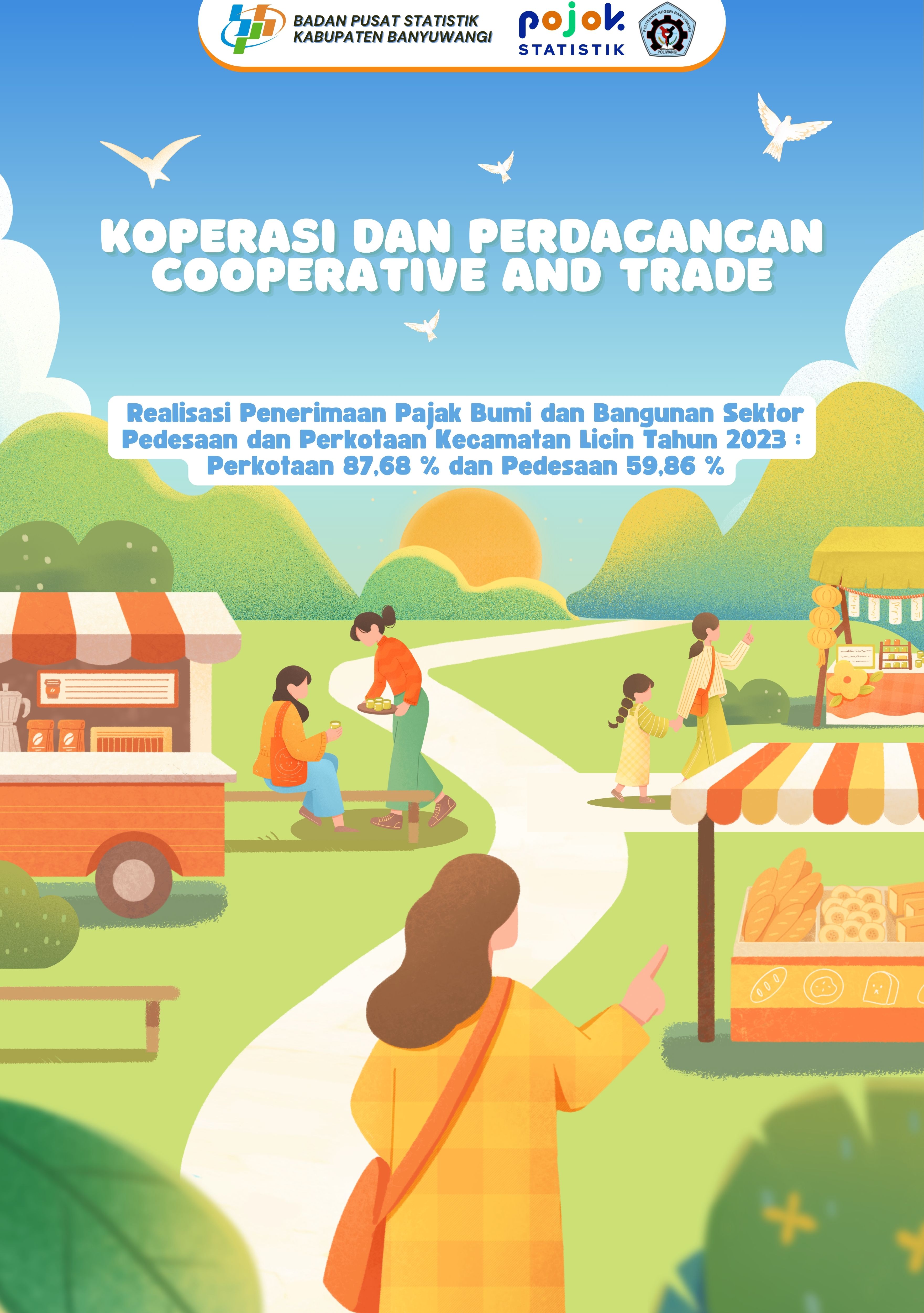 Infografis Koperasi dan Perdagangan menunjukkan realisasi penerimaan pajak bumi dan bangunan sektor perdesaan serta perkotaan di Kecamatan Licin pada Tahun 2023.