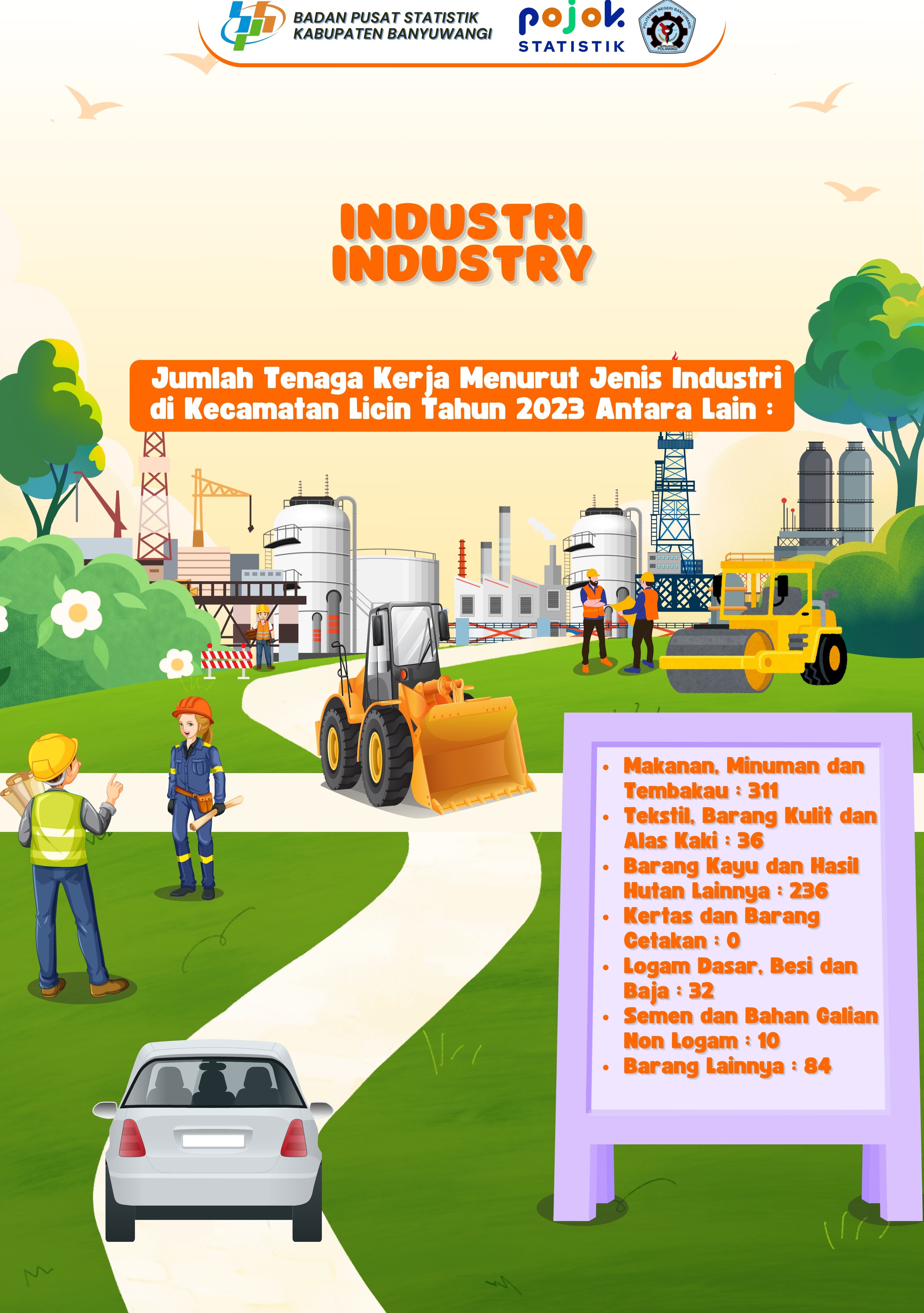 Pada infografis Industri menunjukkan jumlah tenaga kerja menurut jenis industri yang ada di kecamatan Licin pada Tahun 2023.
