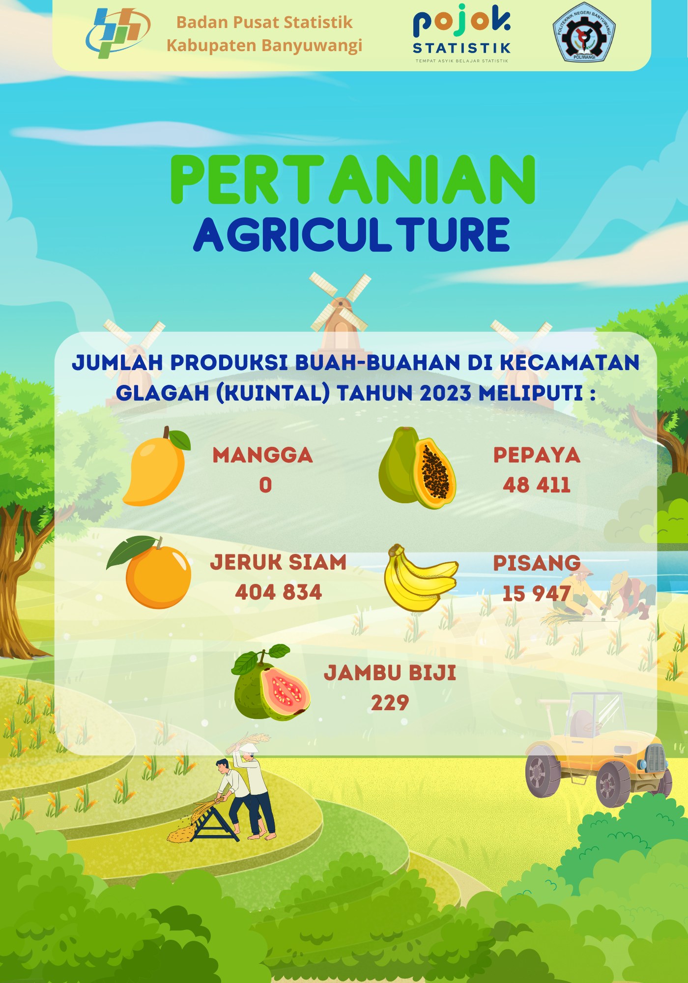 Pada Infografis Pertanian Kecamatan Glagah tersebut menjelaskan mengenai banyaknya jumlah produksi buah-buahan di Kecamatan Glagah dalam kuintal pada tahun 2023