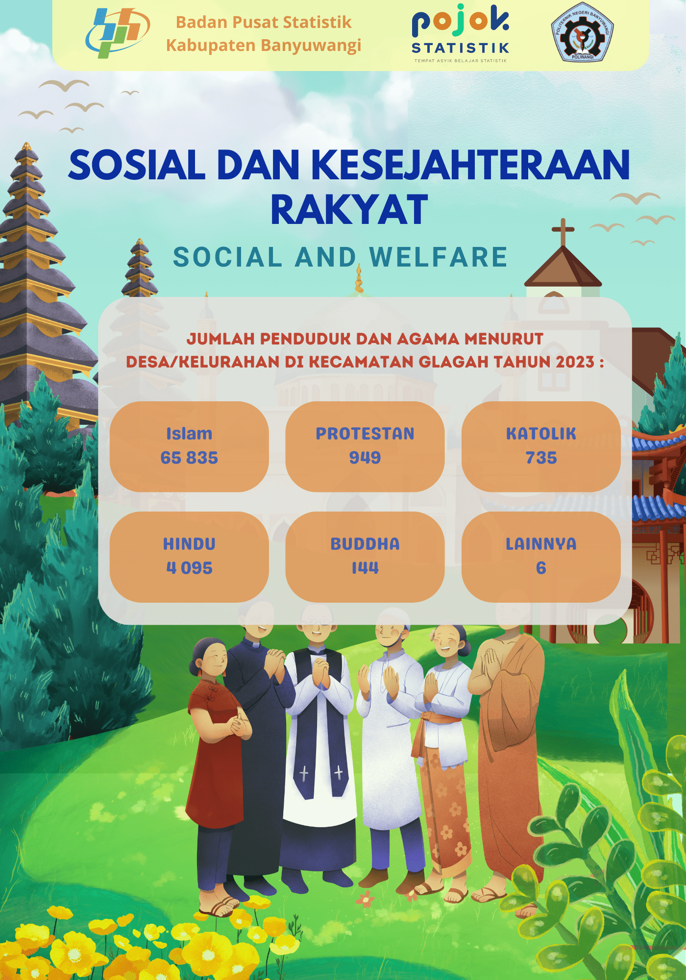 Pada Infografis Sosial dan Kesejahteraan Rakyat Kecamatan Glagah menjelaskan mengenai jumlah penduduk dan agama menurut desa/kelurahan di Kecamatan Glagah pada Tahun 2023